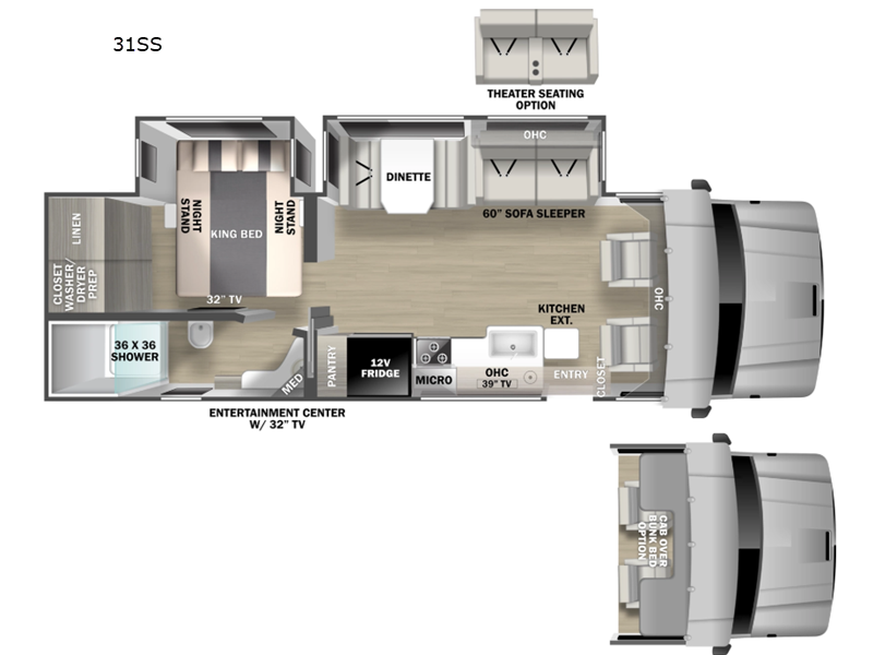 Sleeps 3 Slides 2 Length 33 ft 10 in Ext Width 8 ft 5 in Ext Height 12 ft 8 in Interior Color Driftwood II, Mindful Gray, Milano II, Saddle, Desert (Dealer Stock Only) Exterior Color Full Body Paint; Admiral Blue, Khaki, Quicksilver, Stone Ridge Hitch Weight 15000 lbs GVWR 33000 lbs Fresh Water Capacity 98 gals Grey Water Capacity 52 gals Black Water Capacity 52 gals Tire Size 275/80R 22.5 Furnace BTU 40000 btu Generator 8kW Onan Diesel Fuel Type Diesel Engine Cummins B6.7 Turbo Diesel Chassis Freightliner M2 106B Plus Horsepower 360 hp Fuel Capacity 100 gals Wheelbase 245 in Available Beds King Torque 800 ft-lb Refrigerator Type Residential w/Ice Maker Refrigerator Size 16 cu ft Convection Cooking Yes Cooktop Burners 3 Number of Awnings 1 Axle Weight Front 12000 lbs Axle Weight Rear 21000 lbs LP Tank Capacity 20.3 gals Water Heater Type On Demand LP AC BTU 30000 btu TV Info LR 42" LED Smart TV, BR 32" LED Smart TV, Ext. 32" LED Smart TV Awning Info 16' Armless w/LED Lighting and Motion Activated Retraction Washer/Dryer Available Yes Gross Combined Weight 46000 lbs Shower Type Standard Electrical Service 50 amp Solar Wattage 200 watts Similar Floorplans