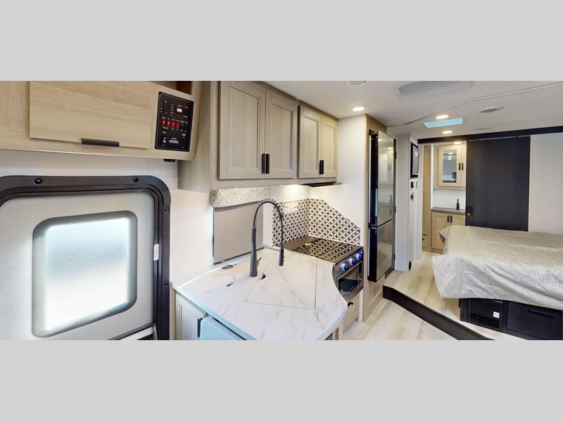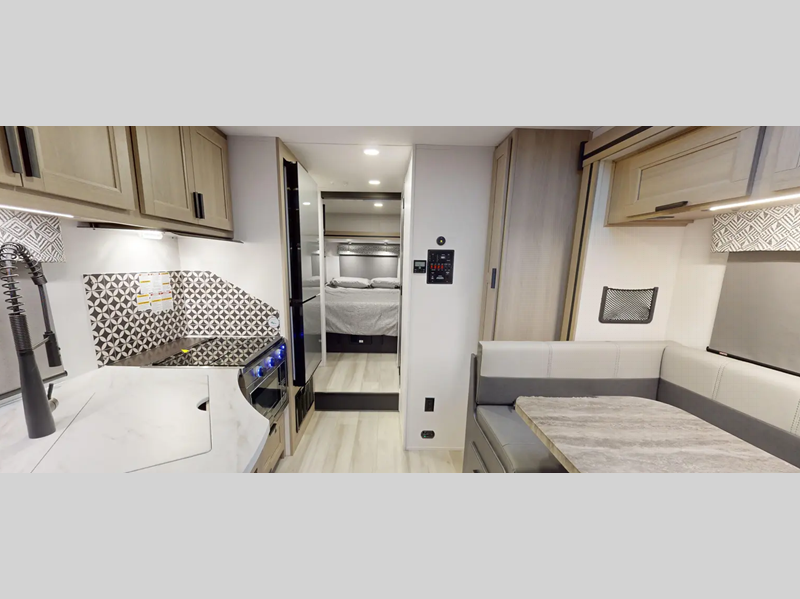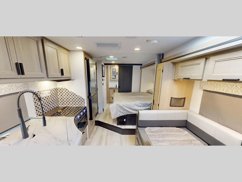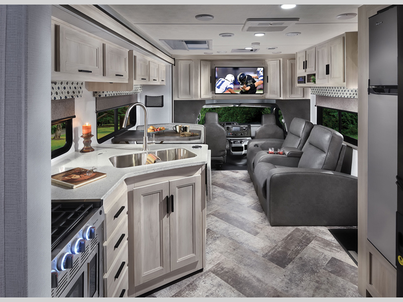 Each model includes an EZ Ryde upgraded suspension system for a smooth drive each time, plus a 10" touch screen and backup camera/side view cameras with a 3-way monitor for easy maneuvering at the campground. The 2" aluminum framed laminated sidewalls and SuperLite composite substrate provide a strong motorhome made to last, and the block foam insulation means you can camp year around. Head inside to find black out roller shades, soft touch self-closing drawer guides, an oxygen-infused shower head, plus a 12V USB charging station to keep your electronics charged and ready to go.
