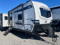 If comfort is what you're looking for, you won't have to search far with this travel trailer! There are dual opposing slides in the main living area for maximum space. The kitchen that flows from the living room area features a high-top dinette that gives a more residential feel to this space, plus there is a pantry, overhead storage, a 10 cu. ft. 12V black glass refrigerator, and more kitchen features you are sure to love. The rear living area includes an EZ-out sofa bed to provide sleeping space for two overnight guests, and there is a theater seat across from the fireplace and HD TV. You'll also enjoy a refreshing drink at the bar top that can also function as a desk! When it's time to call it a night, you can clean up in the spacious full bath, then head to the front bedroom. There is a custom king bed here along with two wardrobes and overhead storage that makes organizing easy!