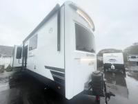 One look at this destination trailer and you'll be sold! You'll love waking up each morning in the master bedroom with a king bed slide out, dual nightstands, and a dresser to keep clothes organized. There is also a spacious front bathroom with a walk-in closet! As you walk to the main living area, you'll find the half bath with washer and dryer prep if you plan to add these appliances. A tri-fold hide-a-bed sofa and theater seating in the living area will let you relax each day, and the bar with stools overlooks the kitchen so you can visit with the chef while dinner is being made.