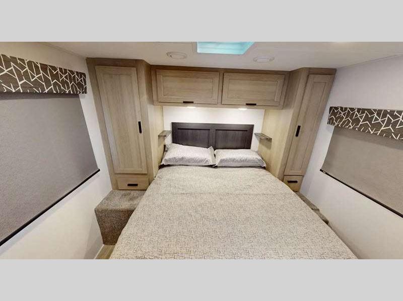 The exterior consists of a fiberglass roof, a one-piece seamless fiberglass cap, slide-out awnings, an integrated entry step, and 2"aluminum framed lamited sidewalls with lightweight composite waterproof material. The sideview and backup cameras will help you park your coach, and the high-pressure oxygen-infused shower head will give you a pleasant shower experience. You'll also have a Maxx Air multi-speed power fan with cover in the kitchen, and another kitchen feature you'll love is the 1.3-cubic foot convection microwave. You also have the ability to add an optional solar-powered 12V charging system.
