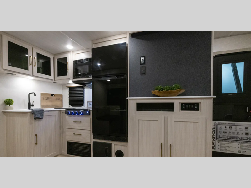 These travel trailers are extended season ready with a 2" aluminum framed floor and block foam insulation, plus there is a sealed underbelly with forced heat and radiant foil insulation. You'll love the Surf(X) seamless countertops throughout, and there is a tankless water heater for endless hot showers. Outside, a power tongue jack is ultra convenient and there is a hot and cold spray port to wash off hiking gear!