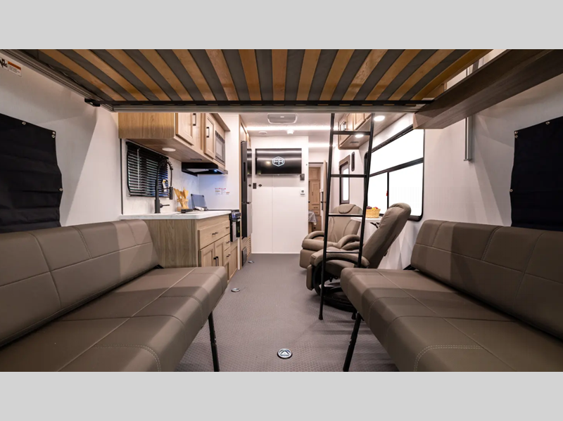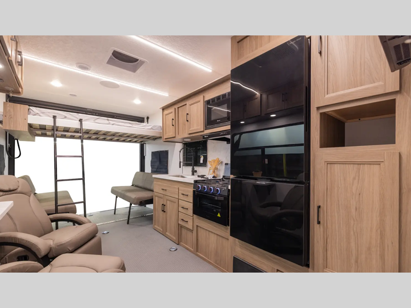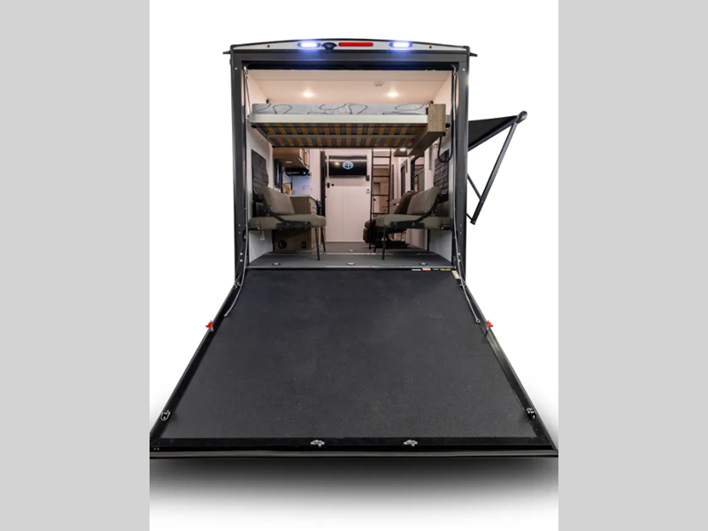 Secure your toys with 1,500 lb. rated D-rings, then roll onto the HD rubberized oil, gas, and moisture resistant flooring in the garage that’s made to handle real use. The 102" wide body construction (96" on LT models) gives you the space you need for your side-by-side or motorcycle, while dual 30 lb. LP tanks, a Velarium Velocity power awning with LED light strip, and rear cargo loading LED lights add convenience at the campsite.