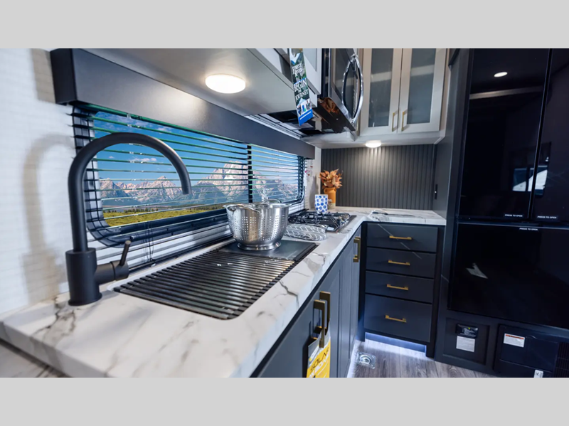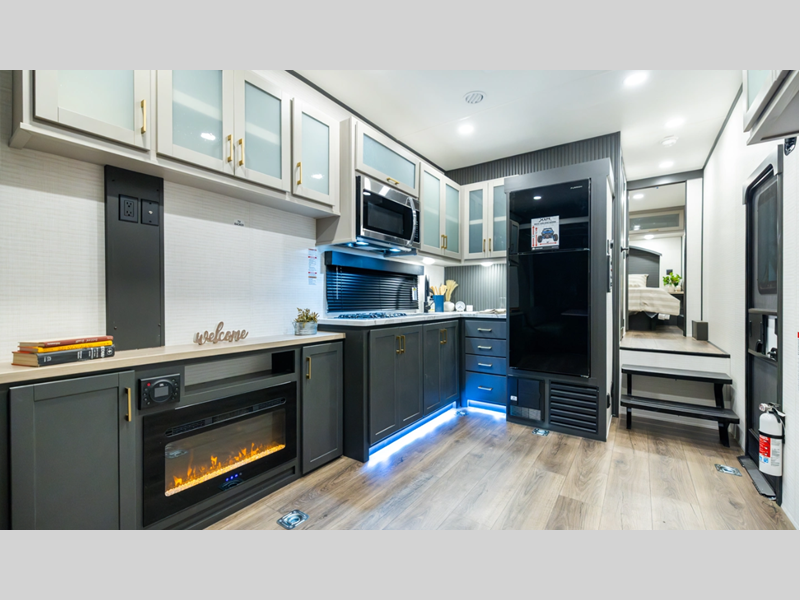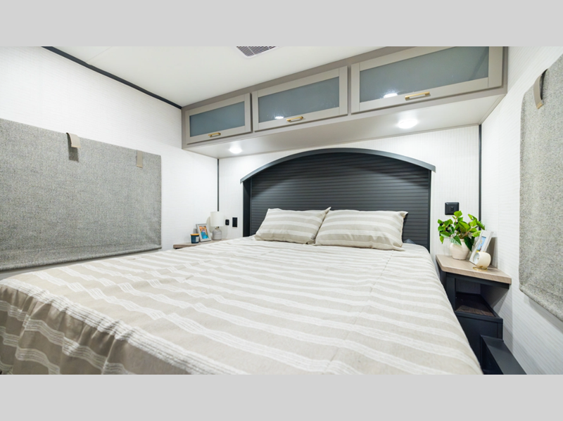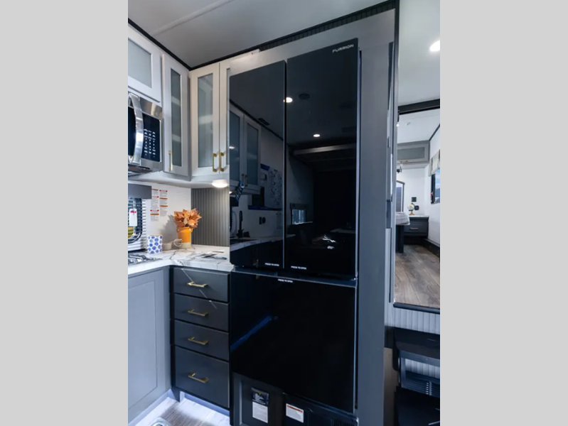 Sleeps 6 Length 31 ft 4 in Ext Width 8 ft 5 in Ext Height 13 ft 4 in Hitch Weight 2090 lbs Dry Weight 9094 lbs Cargo Capacity 5000 lbs Fresh Water Capacity 102 gals Grey Water Capacity 108 gals Black Water Capacity 32 gals Furnace BTU 35000 btu Fuel Capacity 30 gals Number Of Bunks 1 Available Beds King Refrigerator Type 12V French Door Black Refrigerator Size 10 cu ft Convection Cooking Yes Cooktop Burners 3 Shower Size 30" x 36" Number of Awnings 1 Garage Size 16 ft Water Heater Type Tankless AC BTU 15000 btu Awning Info 20' Power Axle Count 2 Shower Type Tub/Shower Combo Electrical Service 50 amp Solar Wattage 200 watts Similar Floorplans
