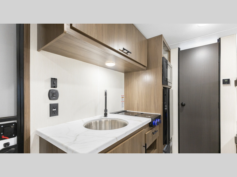 Each is built with an aerodynamic smooth front metal, a fully walkable roof, and automotive grade exterior graphics. All of these construction features will ensure a durable and long-lasting trailer. You will love the seamless pressed countertop inside, along with blackout shades, a large farmhouse one basin sink, and many more comforts!