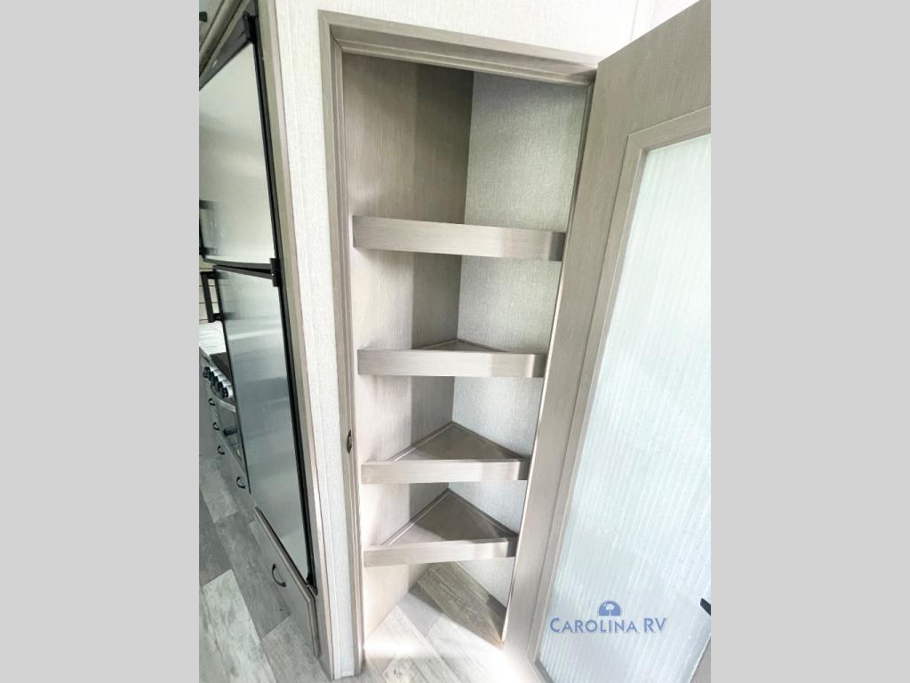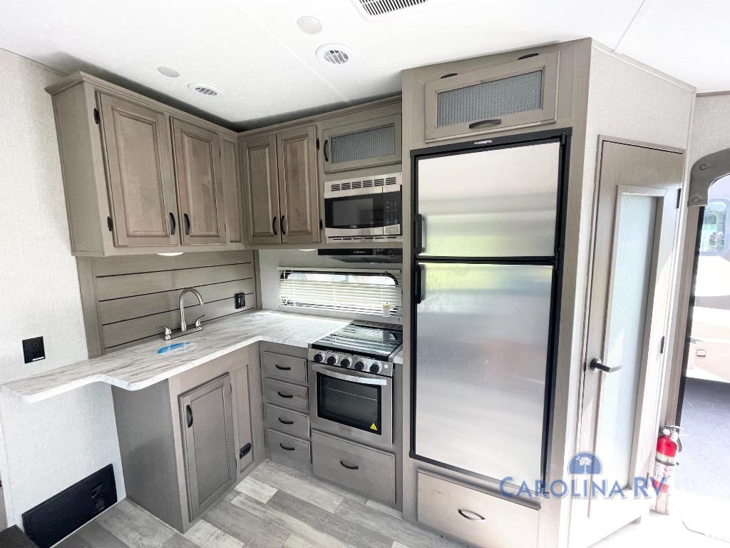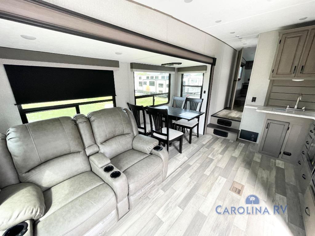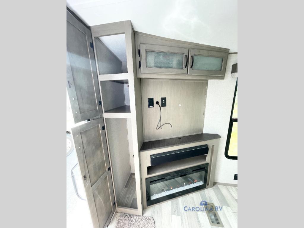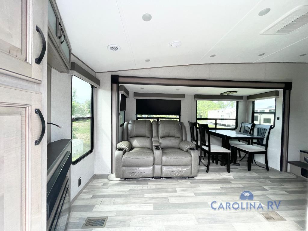 Head to your favorite destinations with your favorite person in this fifth wheel! The front private bedroom has a residential queen bed with a pillowtop mattress, dual nightstands, and overhead storage for your belongings. Freshen up each morning in the full bathroom with the large shower with sliding glass doors and a seat, and there is an LED motion sensor light for nighttime use. You can prepare your best home cooked meals with 21" stainless steel oven with a residential cooktop, and there is an extra deep single basin sink for easy clean up. Eat your meals comfortably at the booth dinette and then relax in the theater seating while you enjoy the entertainment center which has a closet next to it for your storage needs!