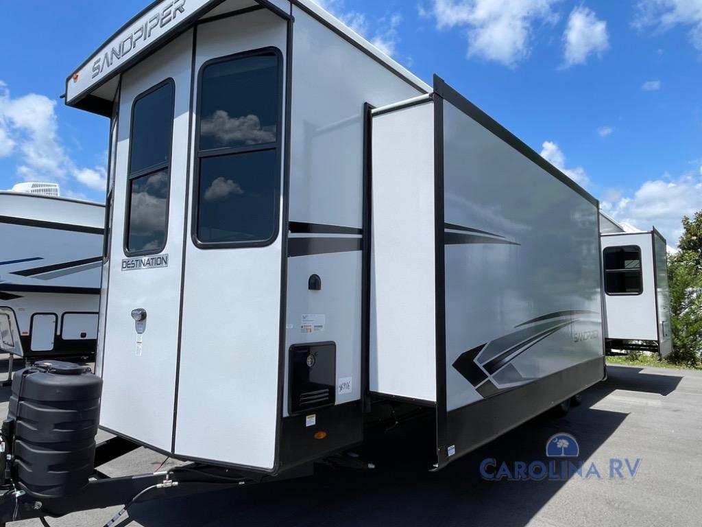 The Sandpiper Destination Trailers by Forest River are ready for extended stays at the location of your choice! The cambered powder coated frame with rust prohibitor will help extend the life of your RV and the Underbelly Armor will protect your trailer and provide better insulation. There are also gel coated color matched exterior fiberglass sidewalls outside, along with rain gutters with extra long drip spouts to prevent black streaking, and exterior speakers to listen to your favorite tunes. The Destination Package includes features to make your trips hassle-free, like the two 15,000 BTU A/C units, detachable hitch, and on-demand water heater. A commercial style kitchen faucet and designer backsplash is included with the Extended Stay Package, as well as a full coach water filter system, solid surface countertops, and a stainless steel apron sink with a strainer to name a few comforts. Available options include a central vacuum system, stabilizer jacks, plus dual pane windows and a 40K BTU furnace!