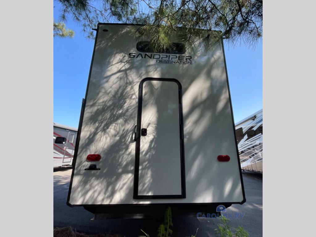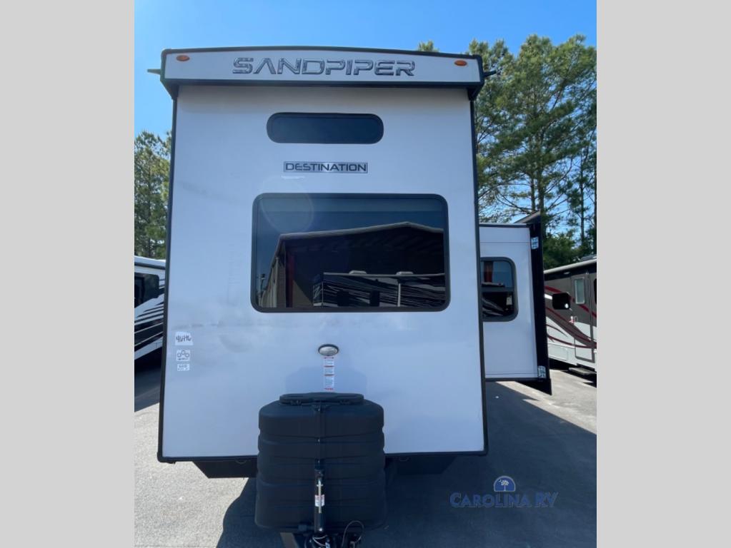 The Sandpiper Destination Trailers by Forest River are ready for extended stays at the location of your choice! The cambered powder coated frame with rust prohibitor will help extend the life of your RV and the Underbelly Armor will protect your trailer and provide better insulation. There are also gel coated color matched exterior fiberglass sidewalls outside, along with rain gutters with extra long drip spouts to prevent black streaking, and exterior speakers to listen to your favorite tunes. The Destination Package includes features to make your trips hassle-free, like the two 15,000 BTU A/C units, detachable hitch, and on-demand water heater. A commercial style kitchen faucet and designer backsplash is included with the Extended Stay Package, as well as a full coach water filter system, solid surface countertops, and a stainless steel apron sink with a strainer to name a few comforts. Available options include a central vacuum system, stabilizer jacks, plus dual pane windows and a 40K BTU furnace!