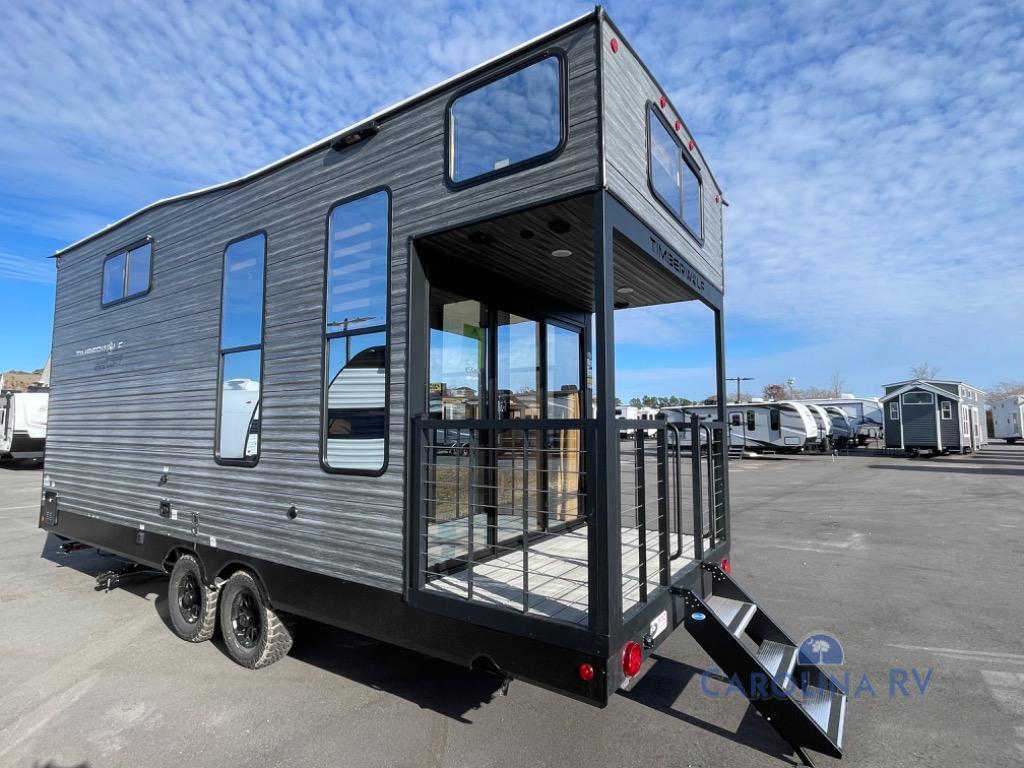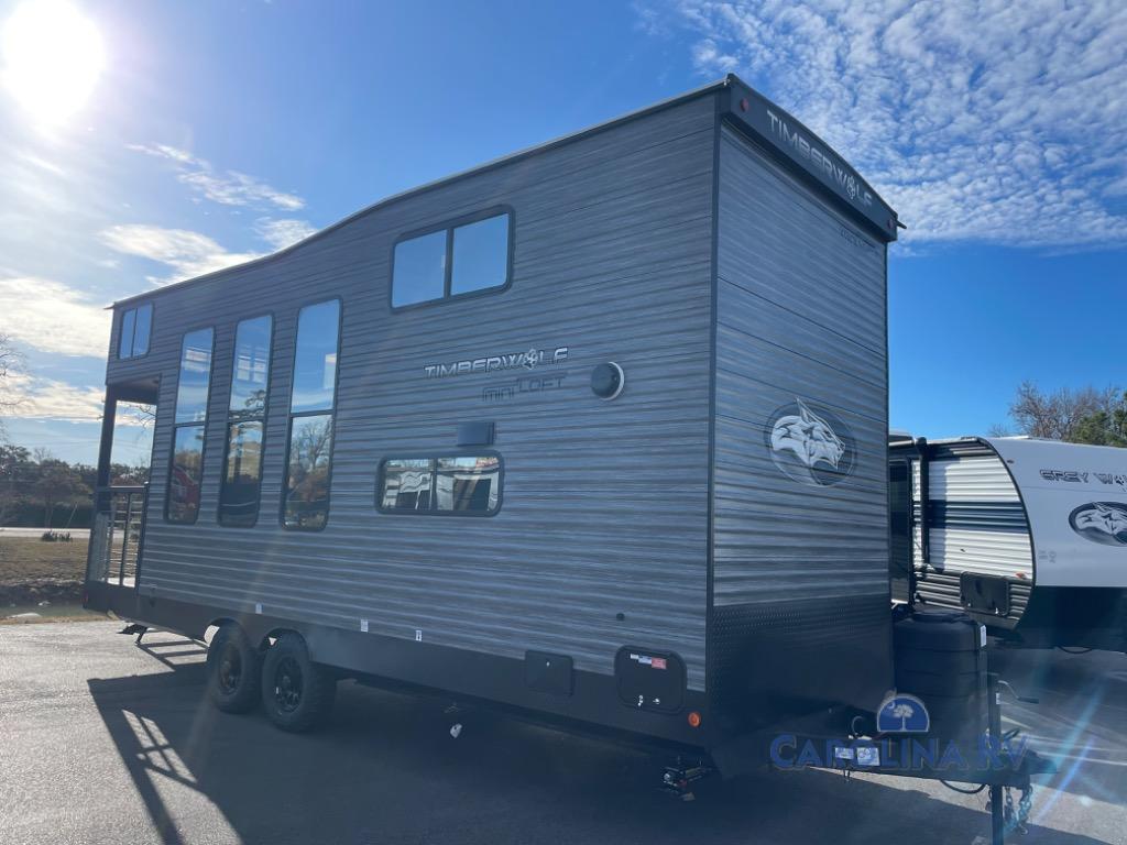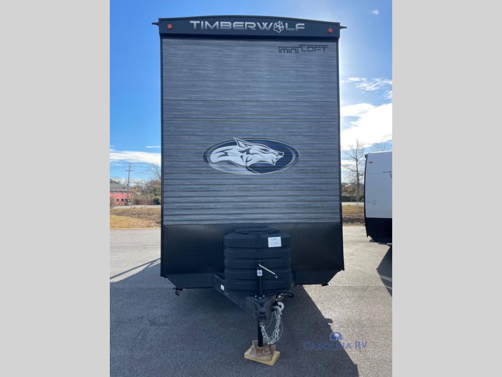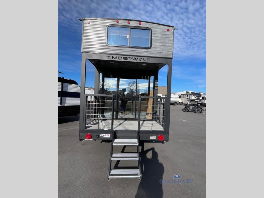 You will fall in love with this mini-loft Timberwolf that will feel more like a tiny home. There are steps leading up to the loft with a queen bed, cabinets, and even a fireplace! The kitchen includes a cooktop and a microwave oven to prepare meals, plus an 11 cu. ft. 12V residential refrigerator with Travel Lock. You'll enjoy relaxing on the 58" sofa, dining at the high top table, or reading a book on the lounge chair. There is also a rear deck with patio doors where you can spend your evenings together, and there is even a second loft above the deck for added sleeping or storage space!