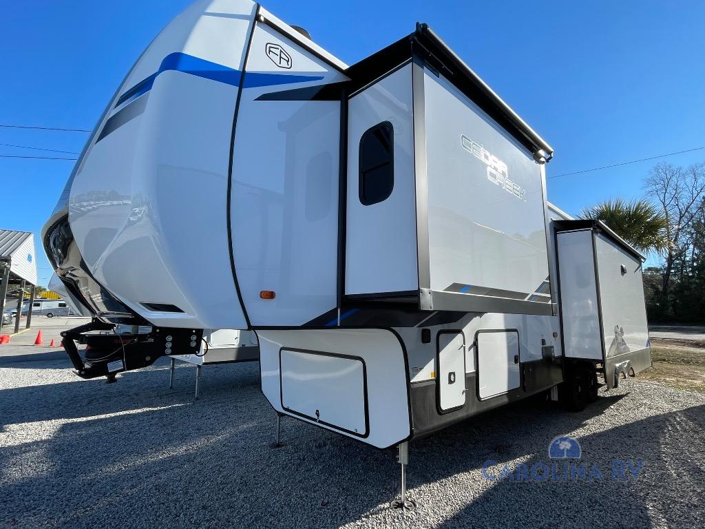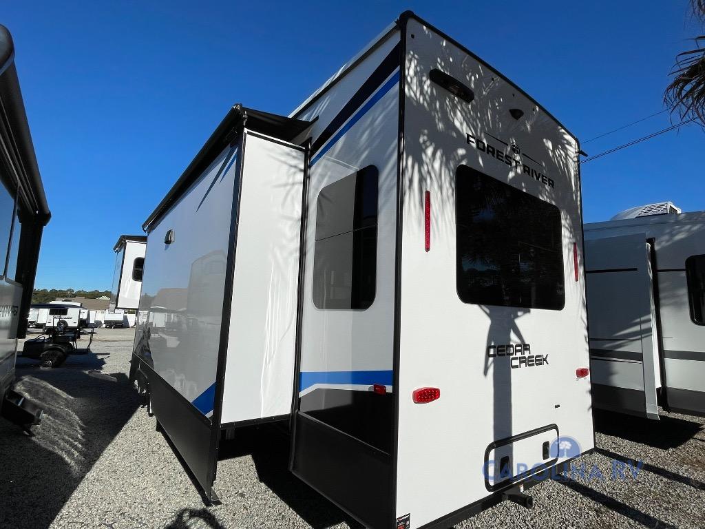 With any Cedar Creek fifth wheel by Forest River, you will find a quality-built RV with your comfort in mind! The all-aluminum super structure on 16" centers or less will provide a solid foundation to your fifth wheel, and the 3M bonded sidewalls will hold up over years of use. Each model also includes a Road Warrior suspension for smooth towing, a 21,000 lb. Rhino box hitch, and a new 101" wide body frame. Inside, you'll enjoy walnut/two tone wooden cabinets and fascias, day/night roller shades, motion lighting in the bath and bedroom closet, plus many more comforts. The new CradlePoint WiFi/5G antenna and Day 1 connectivity will help keep you connected as you travel, and the "Rich Solar" 200W solar panel will give you off-grid capabilities!