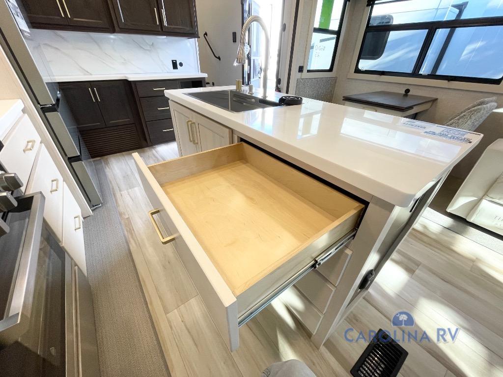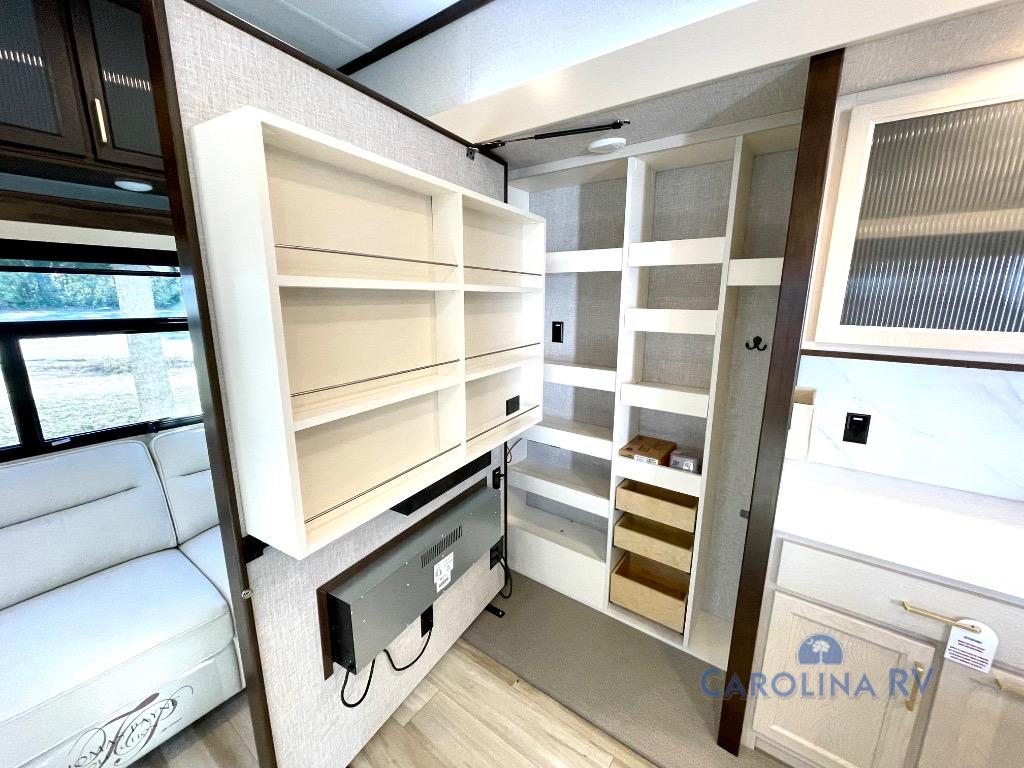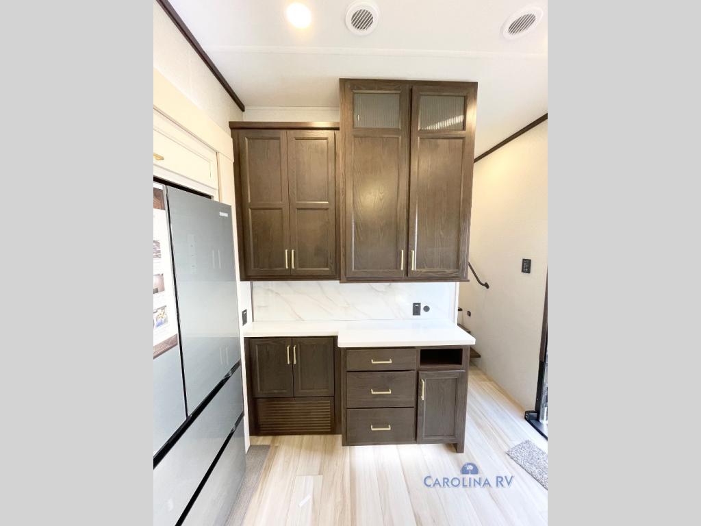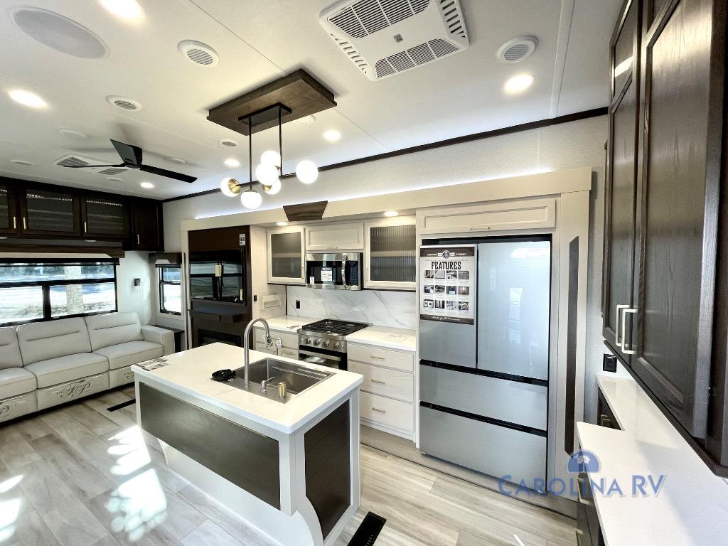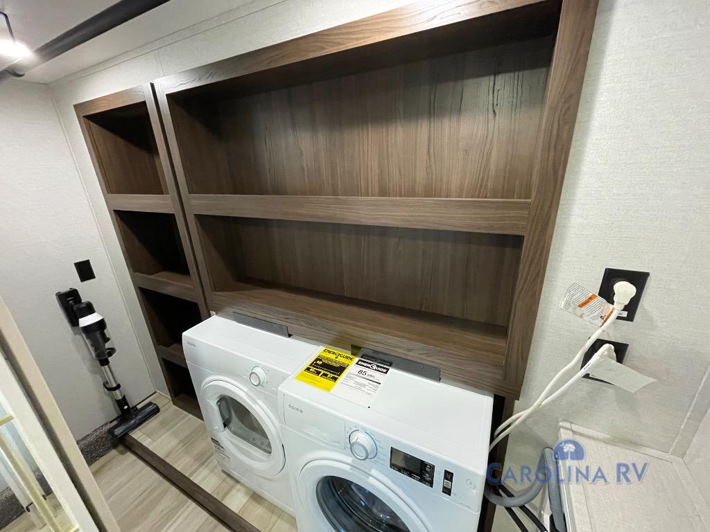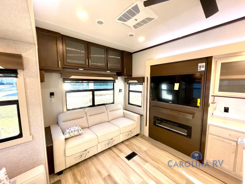 You can bring a guest or two to join in on the fun with this fifth wheel! The rear living area has a hide-a-bed sofa and power theater seating across from the swivel mounted TV and fireplace with a hidden Murphy pantry behind. The chef can prepare their best meals with the kitchen island and your guests will love the fold-down breakfast counter. The full bathroom has a spacious shower with a seat plus a dual sink vanity for convenience. The king bed slide in the front private bedroom welcomes you to enjoy a good night's rest and the front wardrobe has storage shelves and washer/dryer prep if you want the option to wash clothes while you're away from home!