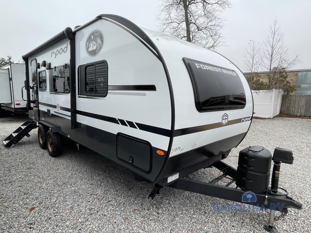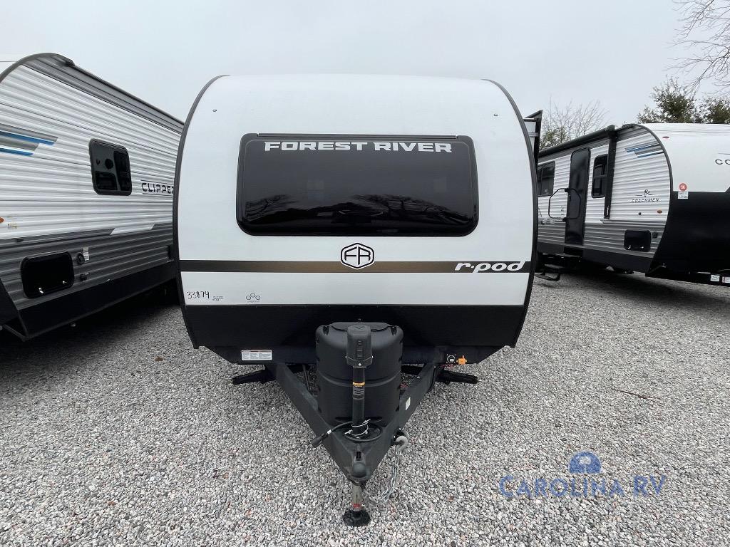 With any R-Pod travel trailer by Forest River, you will enjoy affordable luxury at the lowest tow weight in its class! There is a sealed underbelly with forced heat, a curved dual-pane acrylic front window with a bug screen and night shade, plus a large roof mounted solar panel for off-grid capabilities. The 15K A/C unit will keep you comfortable during the summer camping months, and the tankless water heater will provide endless hot showers after hiking, biking, swimming and more! Each model also includes a black glass friction hinge entrance door, roof ladder prep, exterior motion lighting, plus a hot and cold exterior spray port to wash off sand from the beach. Inside, you'll enjoy seamless Surf-X kitchen countertops, blackout roller shades, and a central vacuum system for hassle-free cleaning!