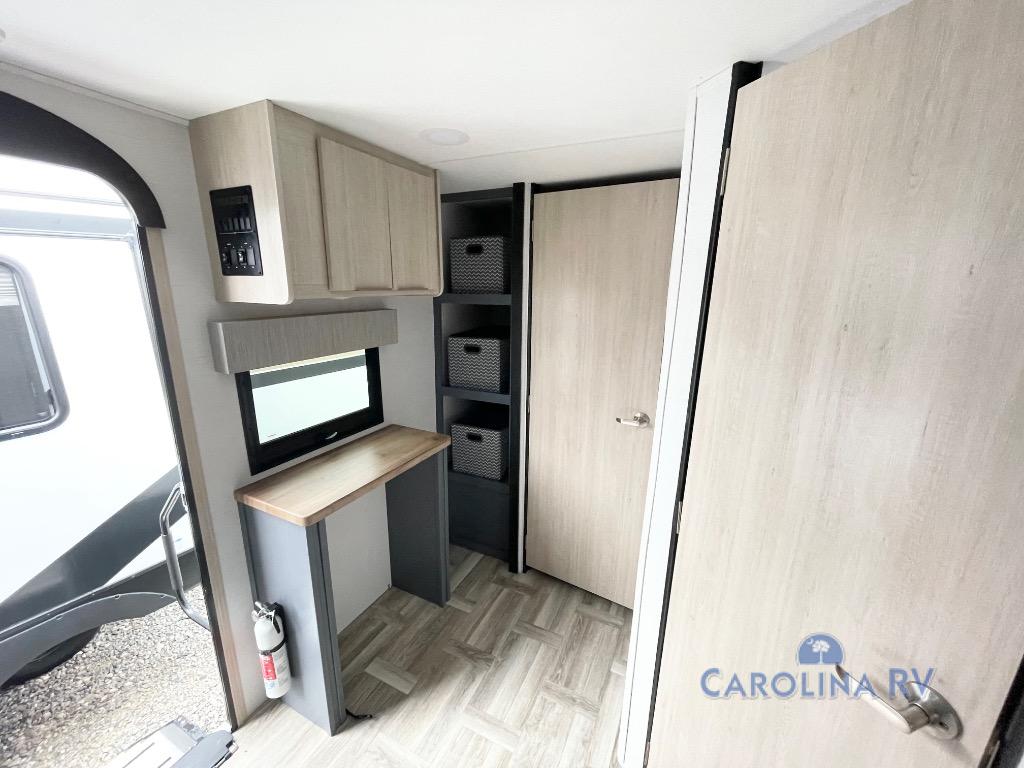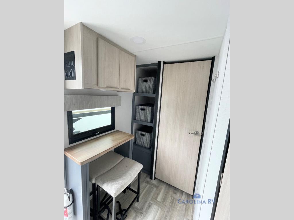 The perfect couple's trailer is found with this RV! You'll enjoy the front private bedroom with its queen bed and dual wardrobes for your things, and the rear corner full bath on board will let you stay clean throughout your trip. In the morning, you can make breakfast in the full kitchen, then dine at the bartop with three stools. There is also a theater seat within the slide out for more comfort and space, plus the pantry and refrigerator are here so you can easily grab a snack. A desk with a chair lets you work while you're away from home if you need to, and there is even a closet with washer and dryer prep if you choose to add those appliances!