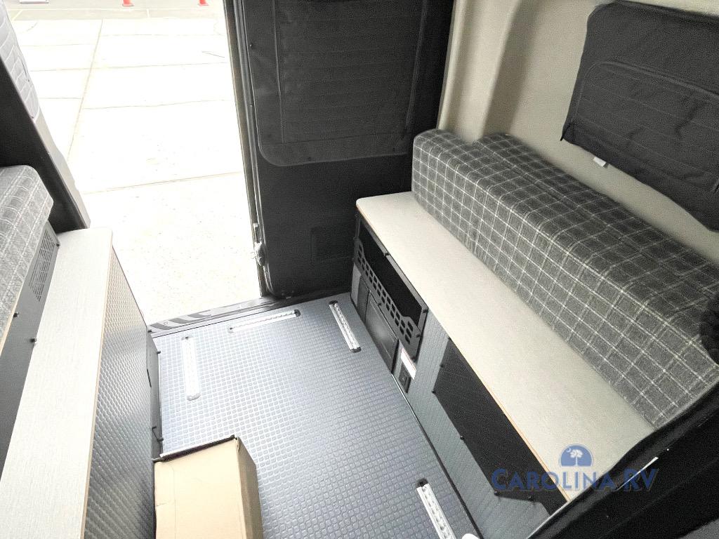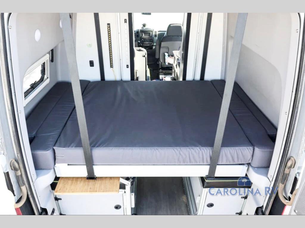 Looking for adventure yet not sure which road you'll take? This camper van offers the outdoor enthusiast a way to venture the unknown. Once at your destination, you can easily set up the interior including a power lift bed in the rear. The cab seats swivel around and there is a bench seat with adjustable table for easy dining opposite. There is even a fold-down outside table to dine outdoors if you want. You will find storage throughout including in the gear garage below the bed where you can store your hiking sticks and backpacks. The cook will have a portable single induction range top, a stainless steel sink, and a counter extension for more prep space plus a refrigerator below the counter. There is also a wet bath to stay clean and refreshed!
