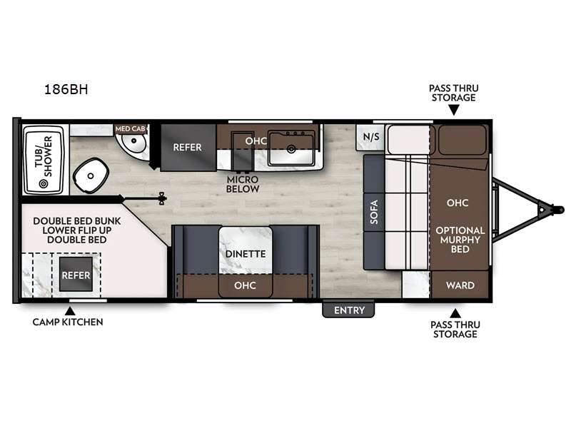 This travel trailer offers versatility with a front fixed bed or optional Murphy bed depending on your needs. There is a rear corner double bed bunk above a lower flip up double bed and a booth dinette that can transform into an extra sleeping space when you're not using it to enjoy a meal or play a card game. Everyone can stay clean with tub/shower in the rear corner bathroom and keep their bellies full with the two burner cooktop and 10 cu. ft. 12V refrigerator. You can even cook outdoors with the exterior camp kitchen while staying protected by the power awning with LED lighting!