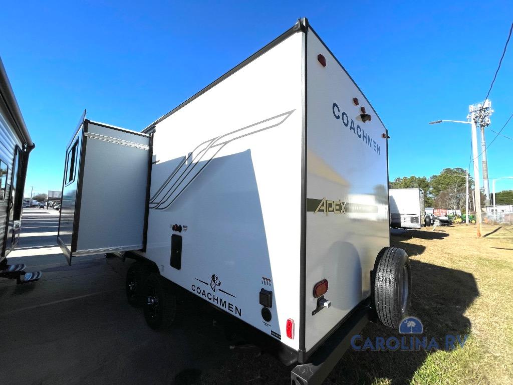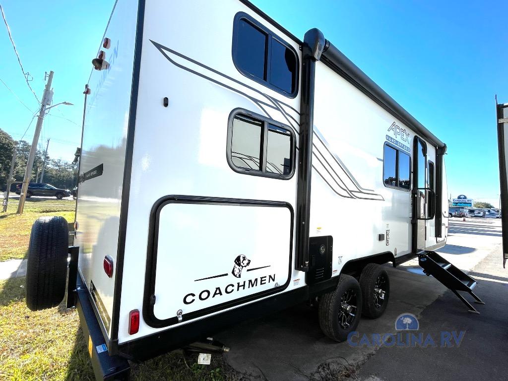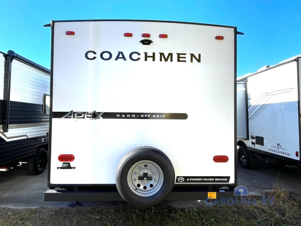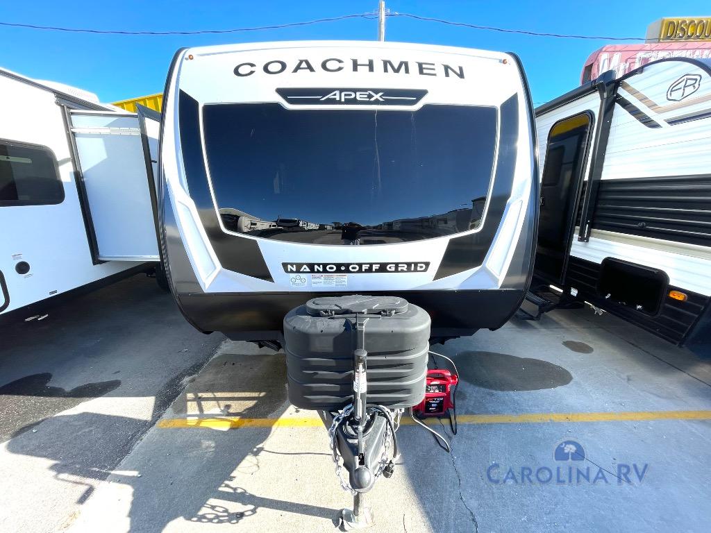 You will find comfort, convenience, and a sturdy construction with each of these Coachmen RV Apex Nano travel trailers! They are held together with an aluma-cage construction, an I-beam chassis, plus vacuum-bonded laminated dual Azdel fiberglass walls for double the protection against the elements. The 400-watt solar panel with a 30 amp control charger is included, along with two 20 lb. LP tanks, a high velocity power roof vent, plus 12V outlets to keep you powered up. More exterior features include a hot/cold shower, four stabilizer jacks, a power awning with LED lighting, and radius thumb latch baggage doors to easily pack and unload your gear. You will love the interior of your Apex Nano with Congoleum residential flooring, one-piece seamless edge countertops, matte black hardware in the galley, and a hand-crafted wood medicine cabinet in the bath.