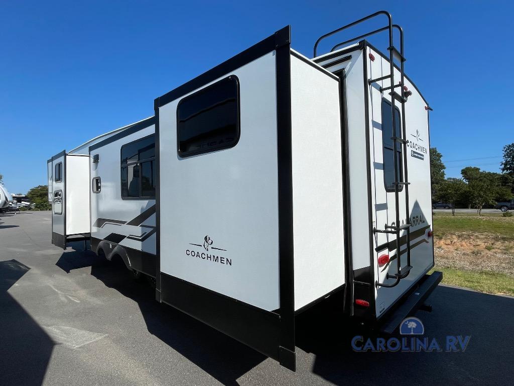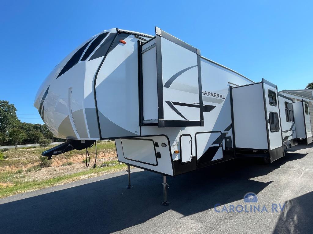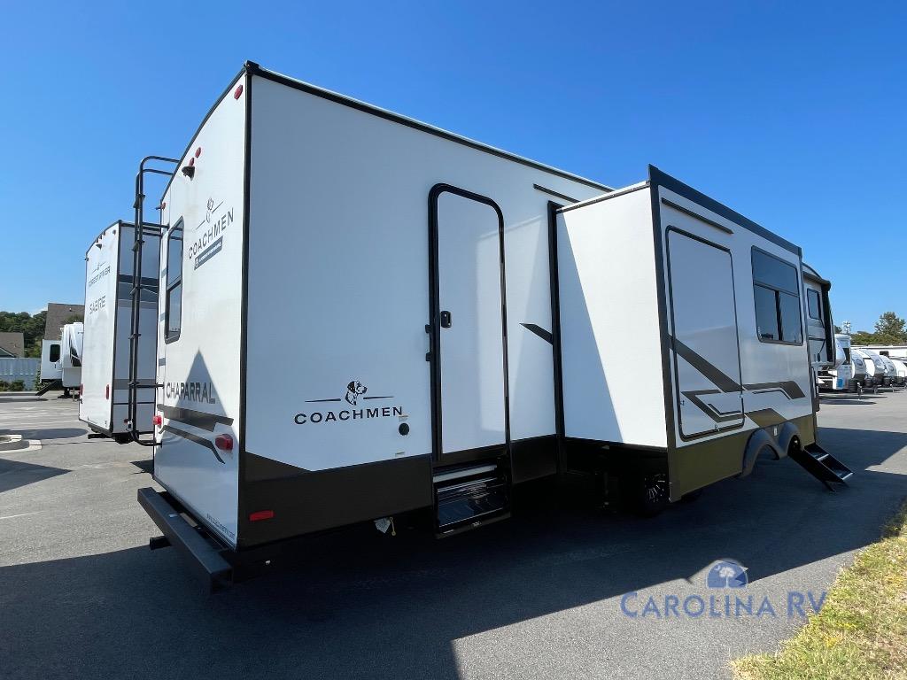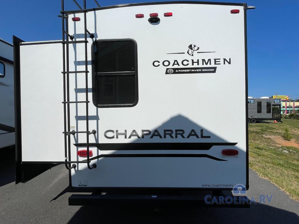 Each Chaparral mid-profile fifth wheel by Coachmen is designed with residential features, loads of storage space, and roomy bedroom suites to make you feel right at home. The durable construction means you can enjoy your RV for years to come. There's 6X double Azdel aluminum cage sidewall system, Weather Shield+ technology, and Tri-Tex powder coated frame technology that will help extend your camping season. Each model includes a Winegard Air 360+ HDTV/radio dome antenna to help keep you connected as you camp, slow rise blackout roller night shades, a new 16 cu. ft. side-by-side stainless glass 12V refrigerator, and a modern electric fireplace to make your space cozy. There is also a large transom window in the kitchen, a modern high-rise faucet, LED motion sensor lights in the bathroom, plus a full-size shower with glass doors and a seat. Now that's what I call luxury! Choose a Chaparral fifth wheel today!