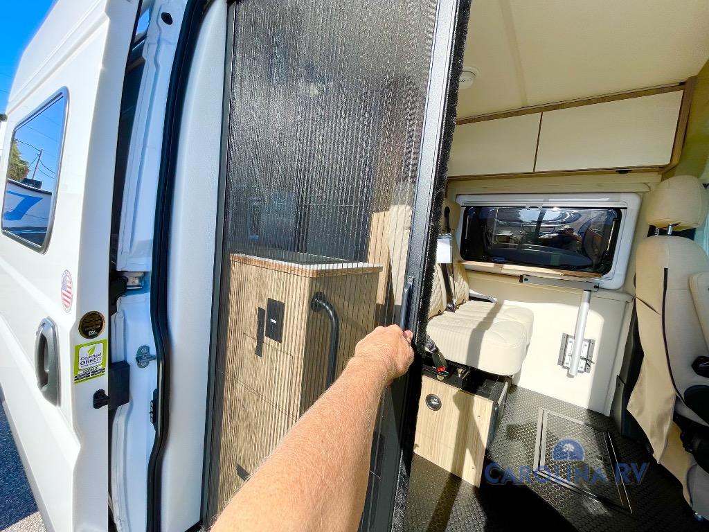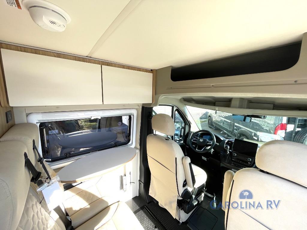 Start a new adventure across the states in this cozy coach! Once you arrive at the campground, you can make lunch on the induction cooktop or in the air fryer/convection microwave. There is also a 7.3 cu. ft. refrigerator with a pull-out freezer drawer to keep your food fresh. You'll find multiple overhead cabinets to keep your belongings tucked out of the way, and the compact wet bath will let you freshen up after a day outdoors. Up front, you'll find two captains seats plus two additional cab seats with a removable table and storage boxes. The 56" x 77" Murphy bed provides versatile sleeping space when you're ready to get some shut-eye. If you're needing additional sleeping space, you can choose the optional pop-top. When the optional pop-top is chosen, the standard Truma A/C is changed out for a Coleman Mach 10 A/C; see dealer for more details.