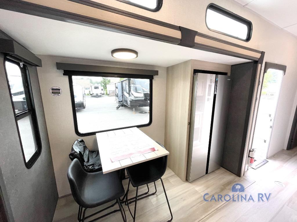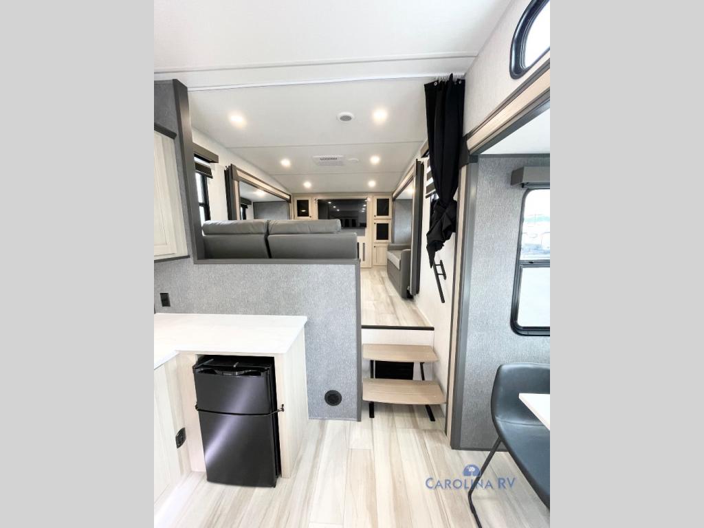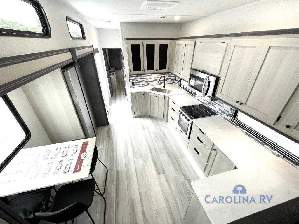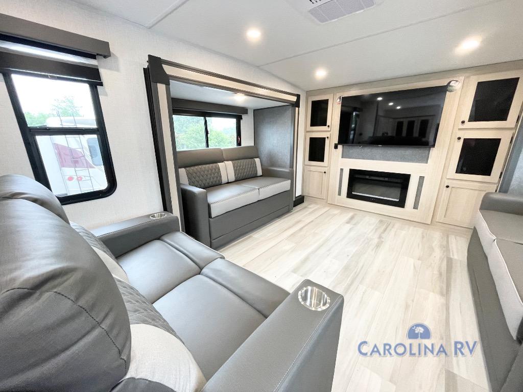 This fifth wheel is packed with features to make each trip enjoyable! The middle kitchen might be your favorite room with wrap-around counter space, a pantry, and a 16 cu. ft. 12V refrigerator for food storage. You can dine at the hi-top table and chairs here, or sit in the front living area on the dual sofas and theater seating! This area can become your guests bedroom at night since there are dual opposing slides and wardrobe storage for their things. You will also find a full-length wardrobe in the rear private bedroom, along with a king bed slide out, plus washer and dryer prep! And of course there is a full bath so everyone can stay clean each day!