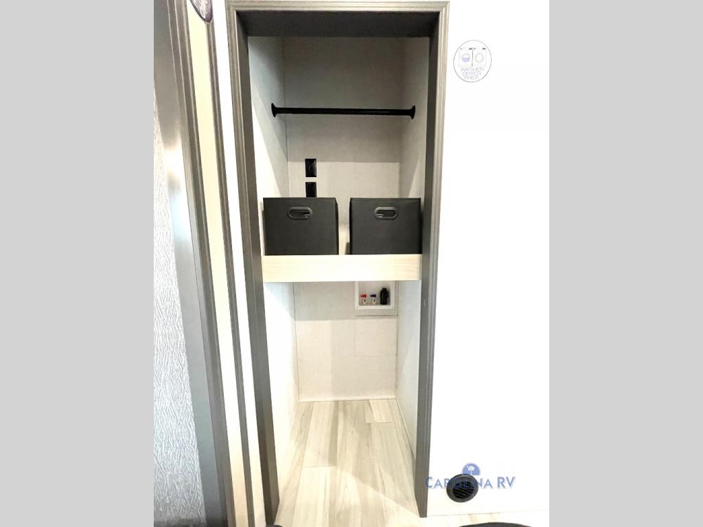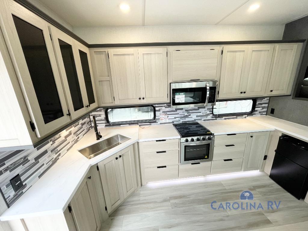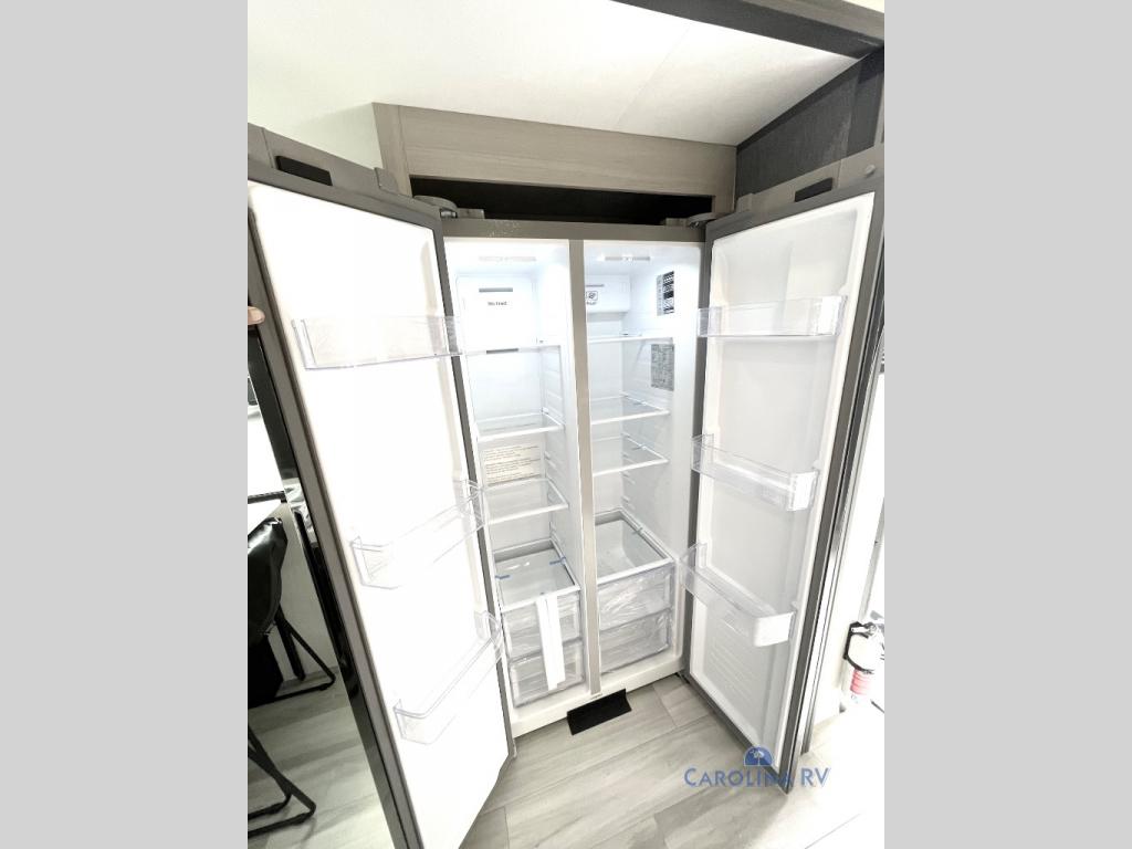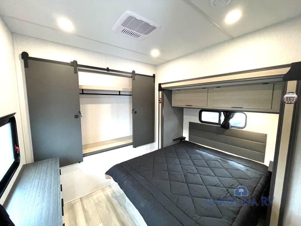 This fifth wheel is packed with features to make each trip enjoyable! The middle kitchen might be your favorite room with wrap-around counter space, a pantry, and a 16 cu. ft. 12V refrigerator for food storage. You can dine at the hi-top table and chairs here, or sit in the front living area on the dual sofas and theater seating! This area can become your guests bedroom at night since there are dual opposing slides and wardrobe storage for their things. You will also find a full-length wardrobe in the rear private bedroom, along with a king bed slide out, plus washer and dryer prep! And of course there is a full bath so everyone can stay clean each day!