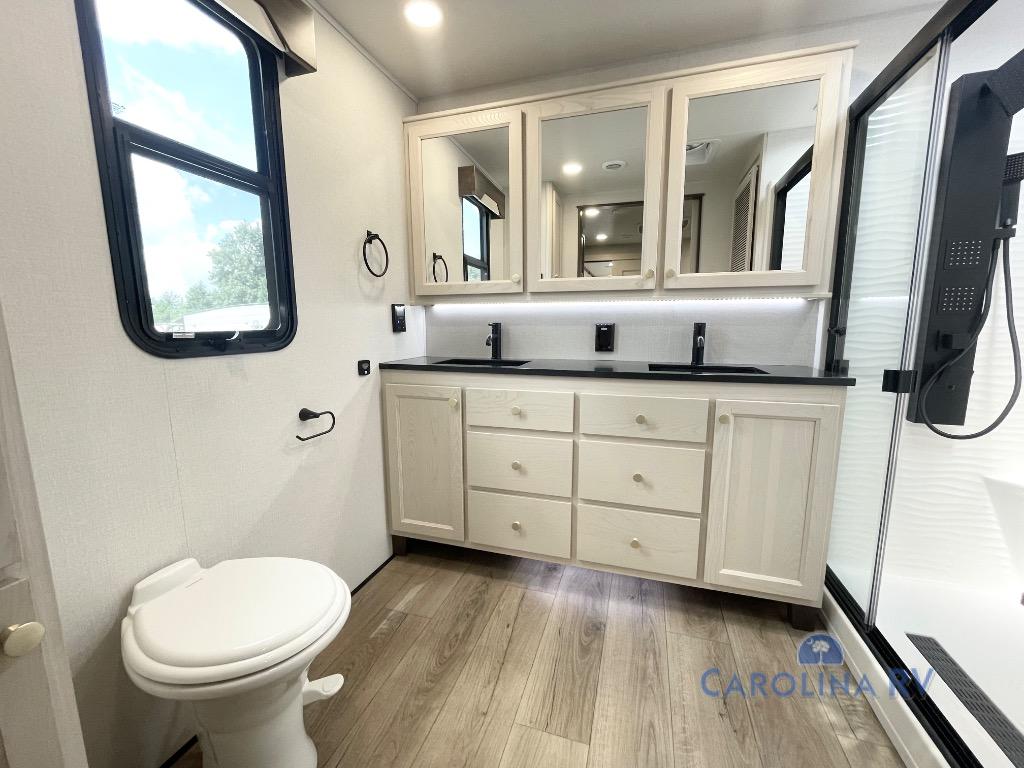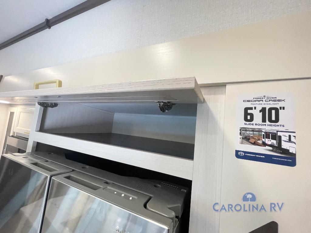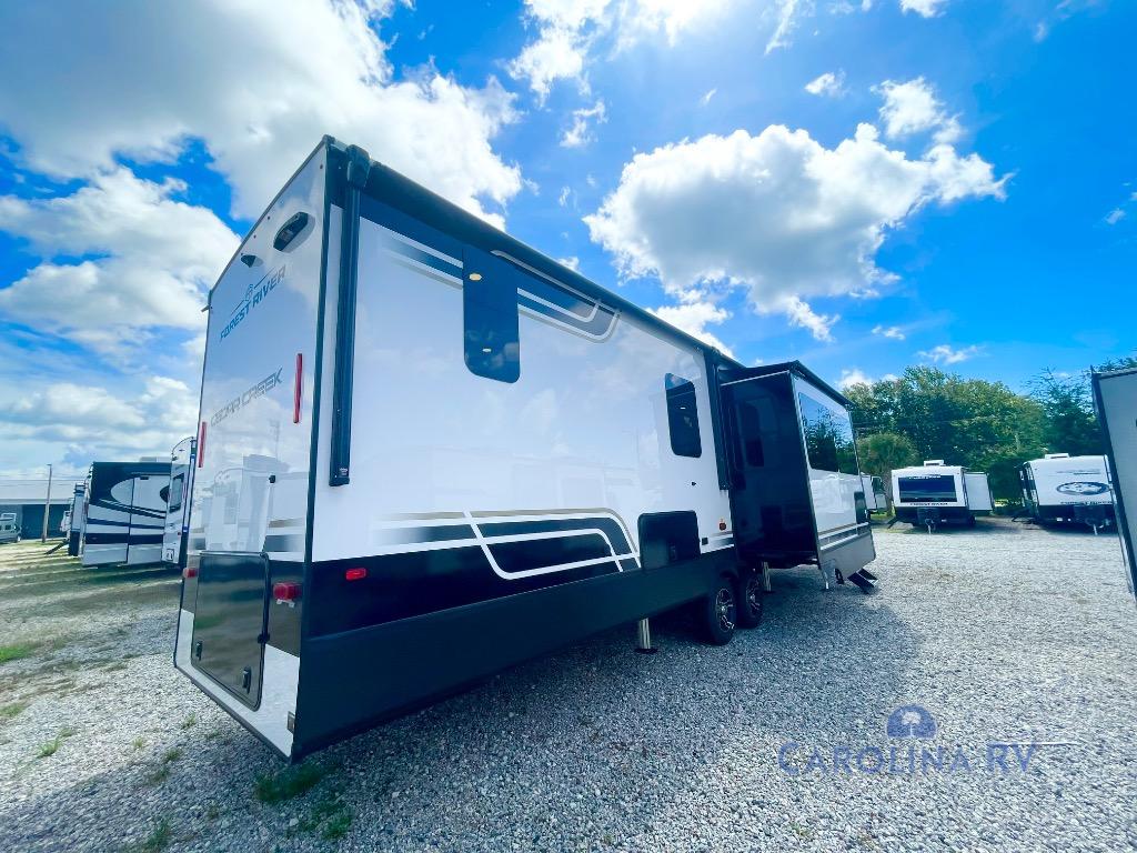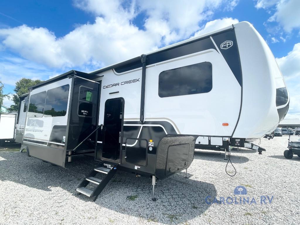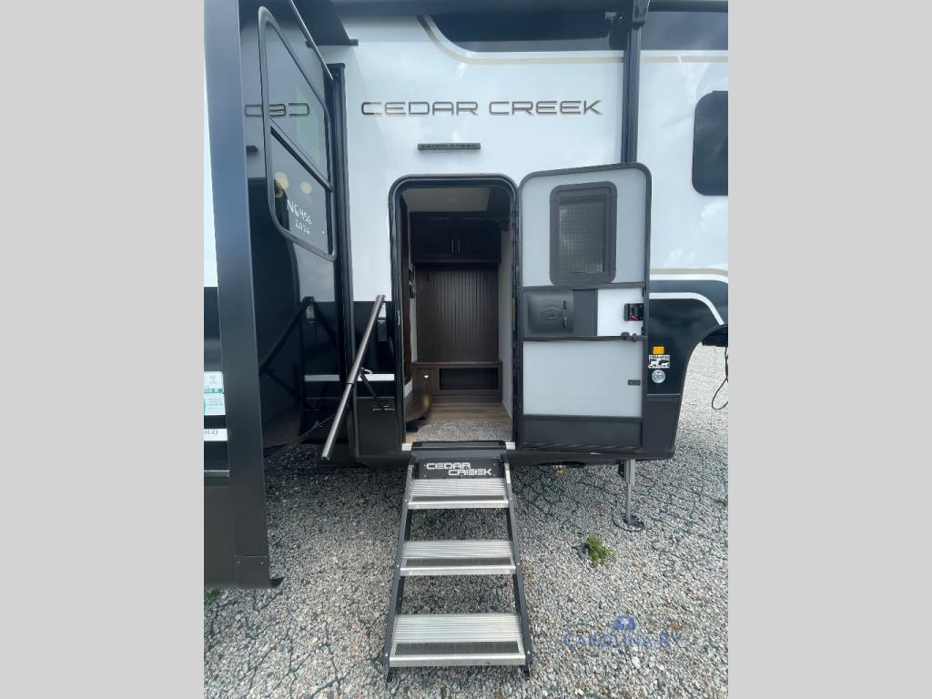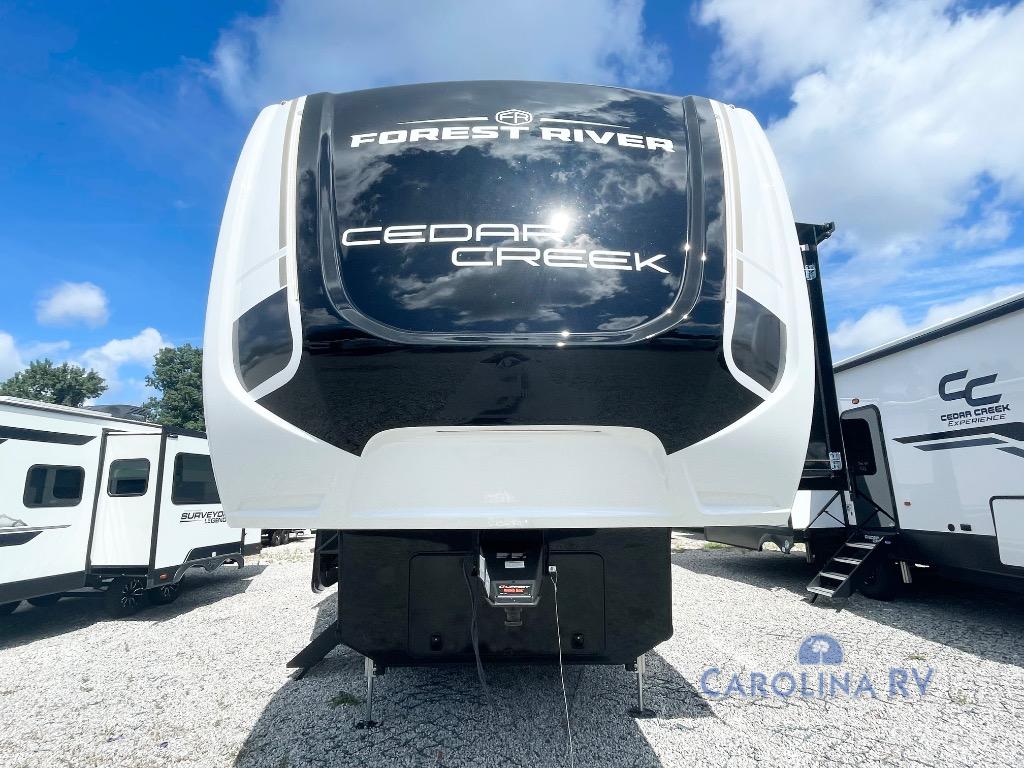 With any Cedar Creek fifth wheel by Forest River, you will find a quality-built RV with your comfort in mind! The all-aluminum super structure on 16" centers or less will provide a solid foundation to your fifth wheel, and the 3M bonded sidewalls will hold up over years of use. Each model also includes a Road Warrior suspension for smooth towing, a 21,000 lb. Rhino box hitch, and a new 101" wide body frame. Inside, you'll enjoy walnut/two tone wooden cabinets and fascias, day/night roller shades, motion lighting in the bath and bedroom closet, plus many more comforts. The new CradlePoint WiFi/5G antenna and Day 1 connectivity will help keep you connected as you travel, and the "Rich Solar" 200W solar panel will give you off-grid capabilities!