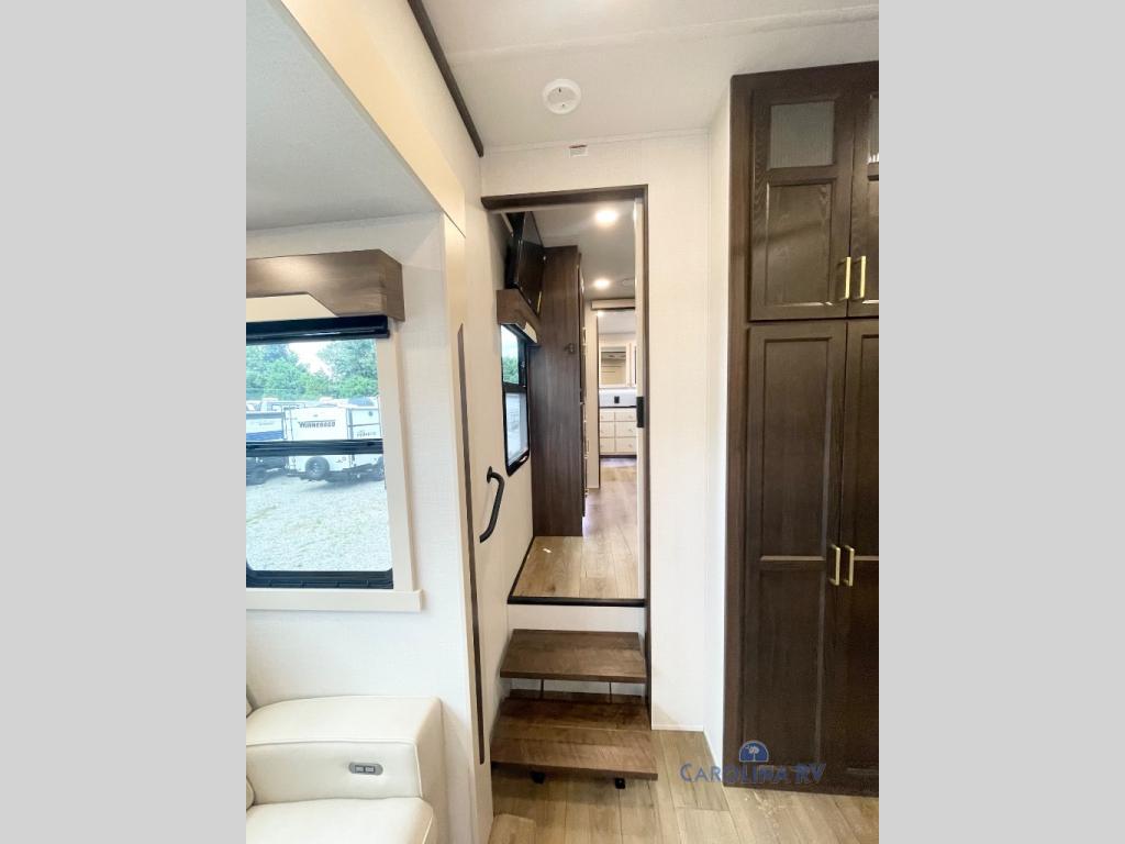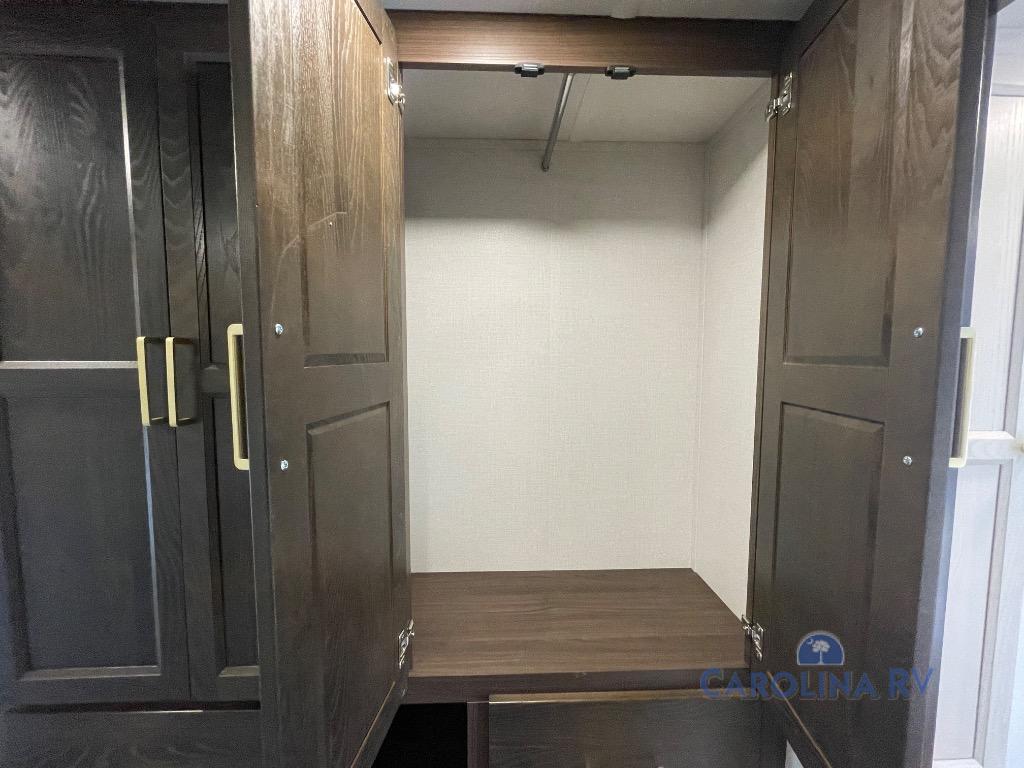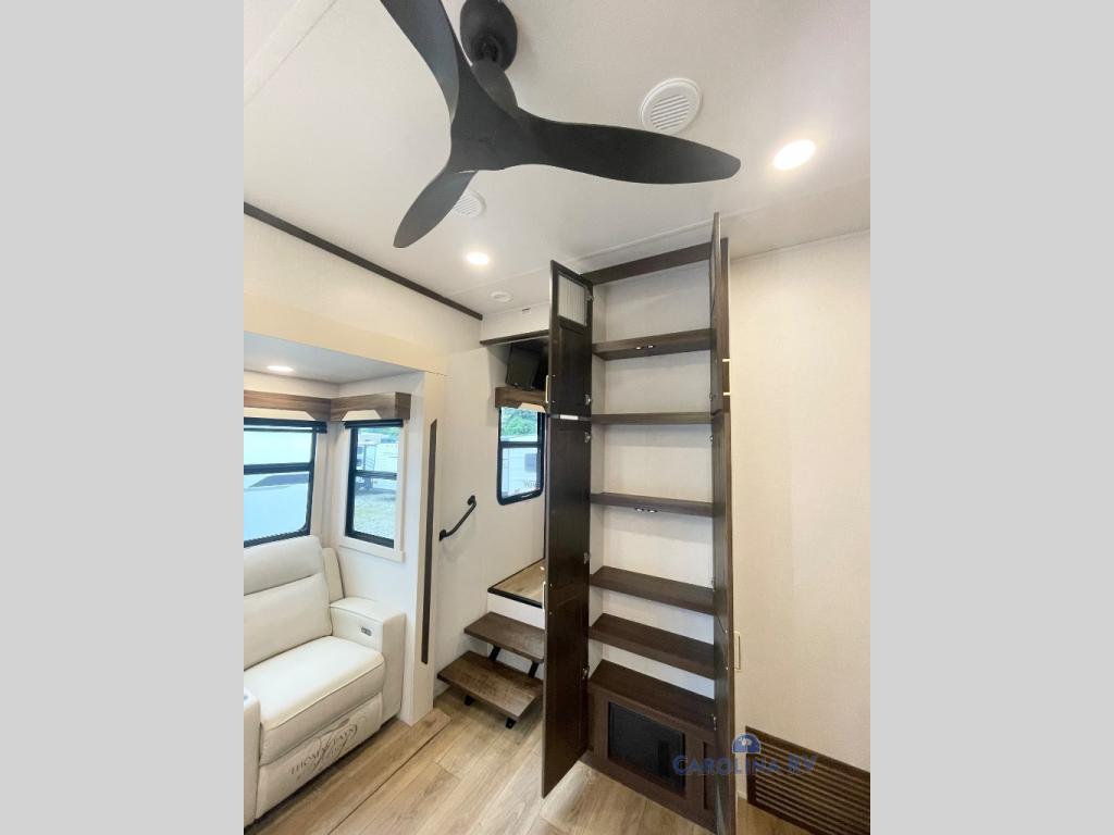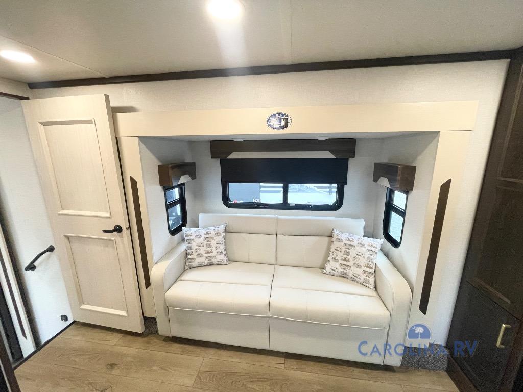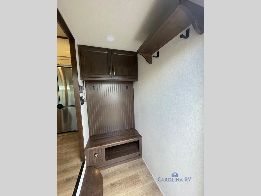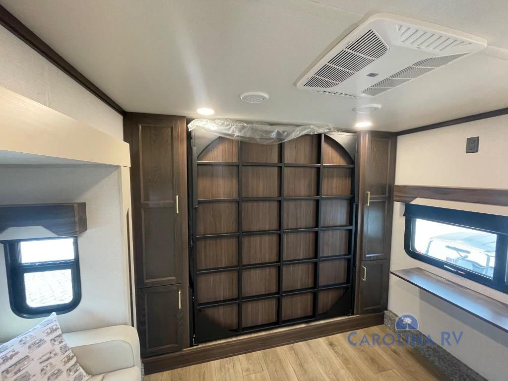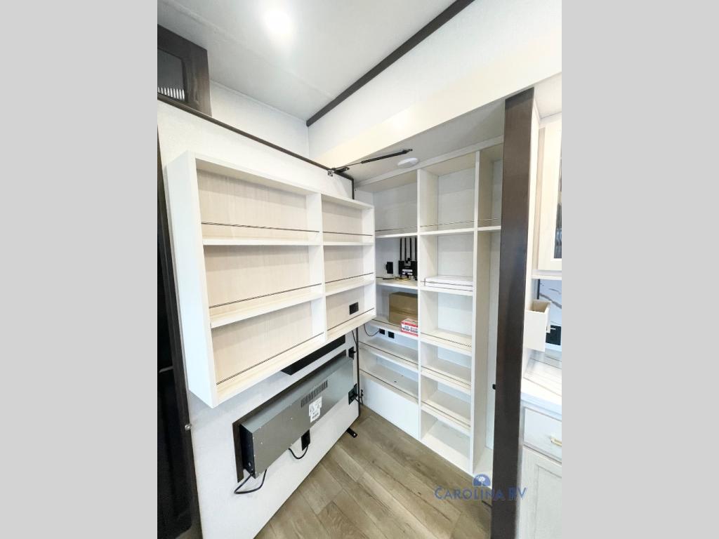 You won't believe all this fifth wheel has to offer! There is a convenient mud room right as you enter the unit where you can use the bench to take your shoes off and not drag dirt in the living areas. The front bedroom includes a jackknife sofa slide out, a half bath, plus a Murphy bed so this room can be used as a guest room! And the loft access is in this room to house more guests or use as storage space. Your crew will love to meet in the middle combined kitchen and living area with power theater seats, a wall mounted dining table with an extension and an ottoman, plus a kitchen island with a fold-down breakfast counter. There is also a Murphy pantry hidden behind the entertainment center and all the appliances needed to make meals each day. You will be met with comfort in the master bedroom that includes a king bed slide out, a dresser and a TV, plus a full rear bath with dual bath sinks. You will also find a shower with a seat, washer/dryer prep, and drop-down storage under the rear bedroom/bathroom so nothing gets left behind!