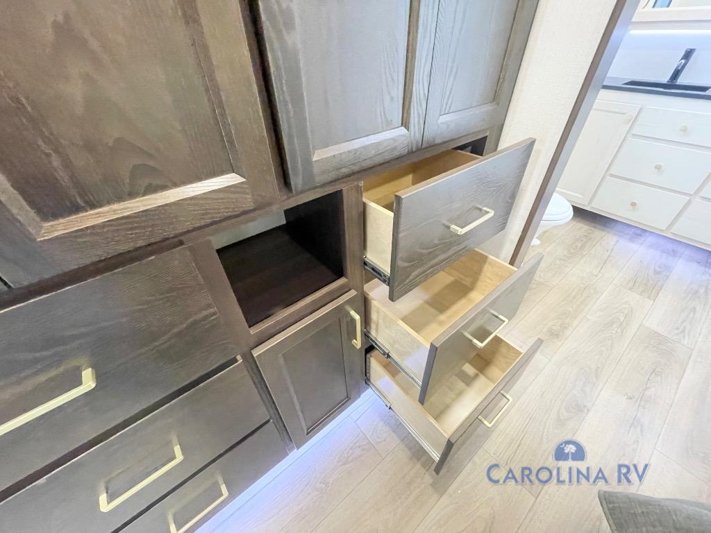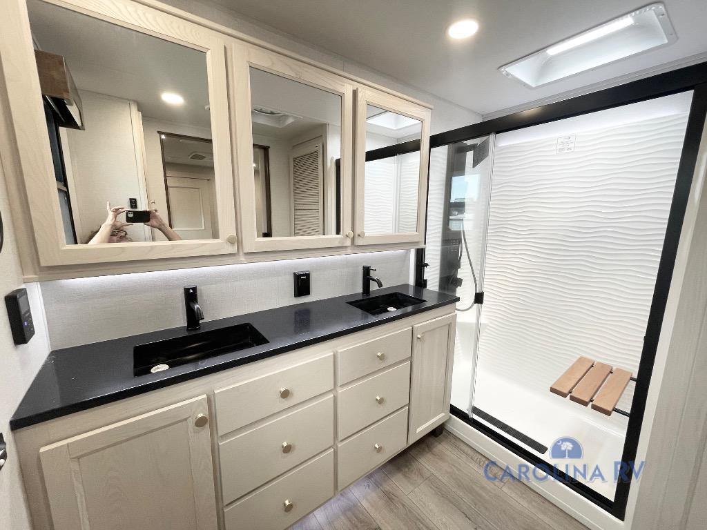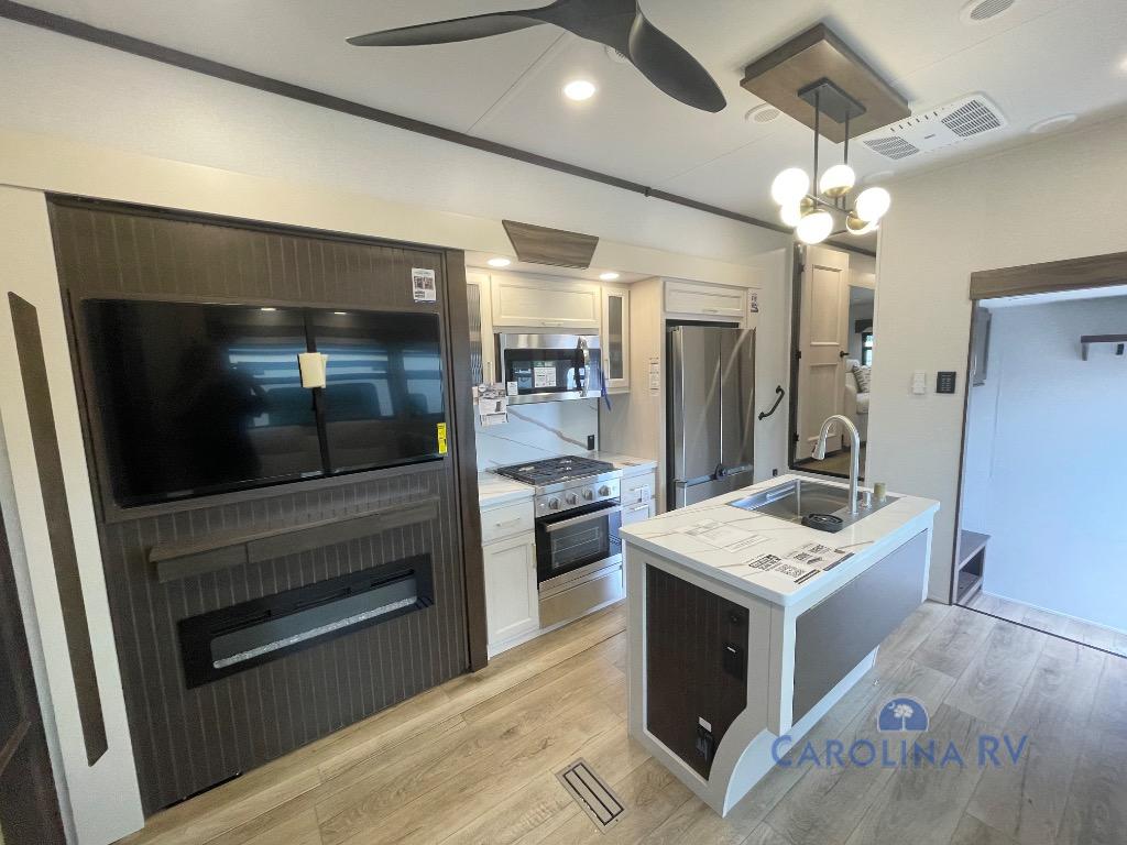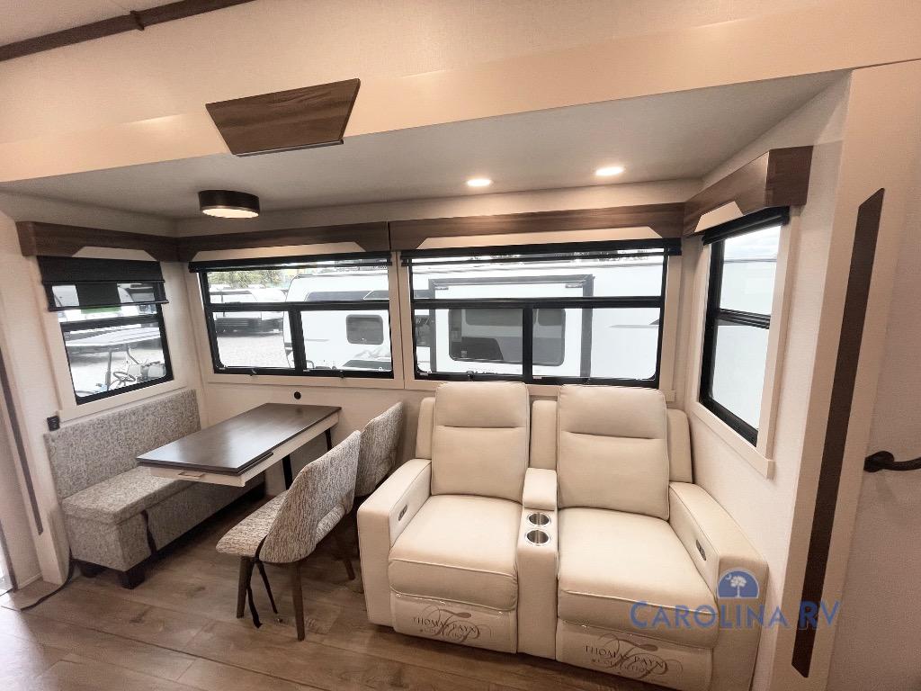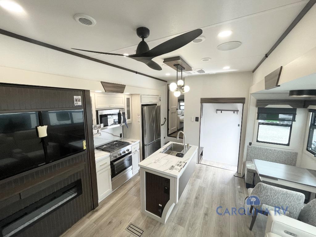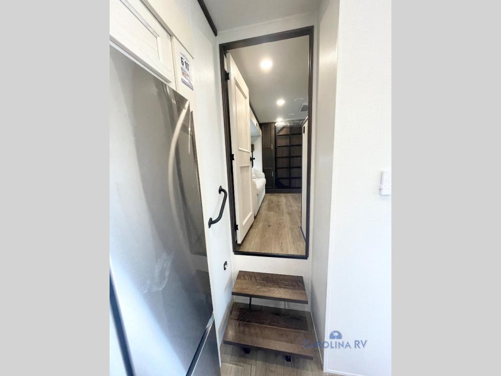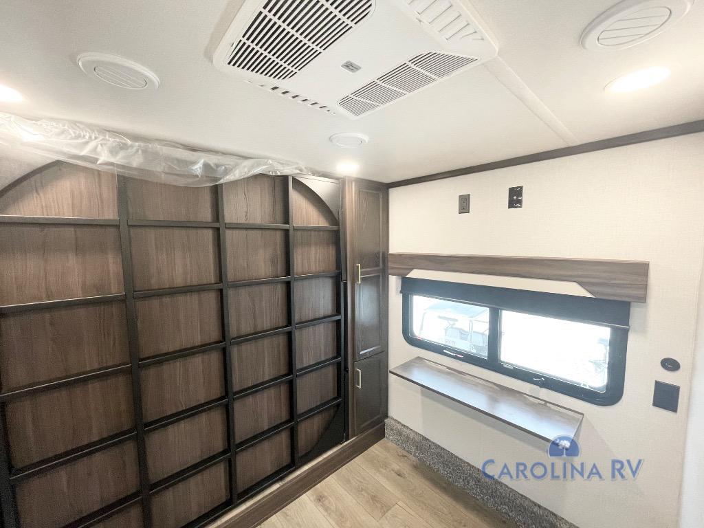 You won't believe all this fifth wheel has to offer! There is a convenient mud room right as you enter the unit where you can use the bench to take your shoes off and not drag dirt in the living areas. The front bedroom includes a jackknife sofa slide out, a half bath, plus a Murphy bed so this room can be used as a guest room! And the loft access is in this room to house more guests or use as storage space. Your crew will love to meet in the middle combined kitchen and living area with power theater seats, a wall mounted dining table with an extension and an ottoman, plus a kitchen island with a fold-down breakfast counter. There is also a Murphy pantry hidden behind the entertainment center and all the appliances needed to make meals each day. You will be met with comfort in the master bedroom that includes a king bed slide out, a dresser and a TV, plus a full rear bath with dual bath sinks. You will also find a shower with a seat, washer/dryer prep, and drop-down storage under the rear bedroom/bathroom so nothing gets left behind!