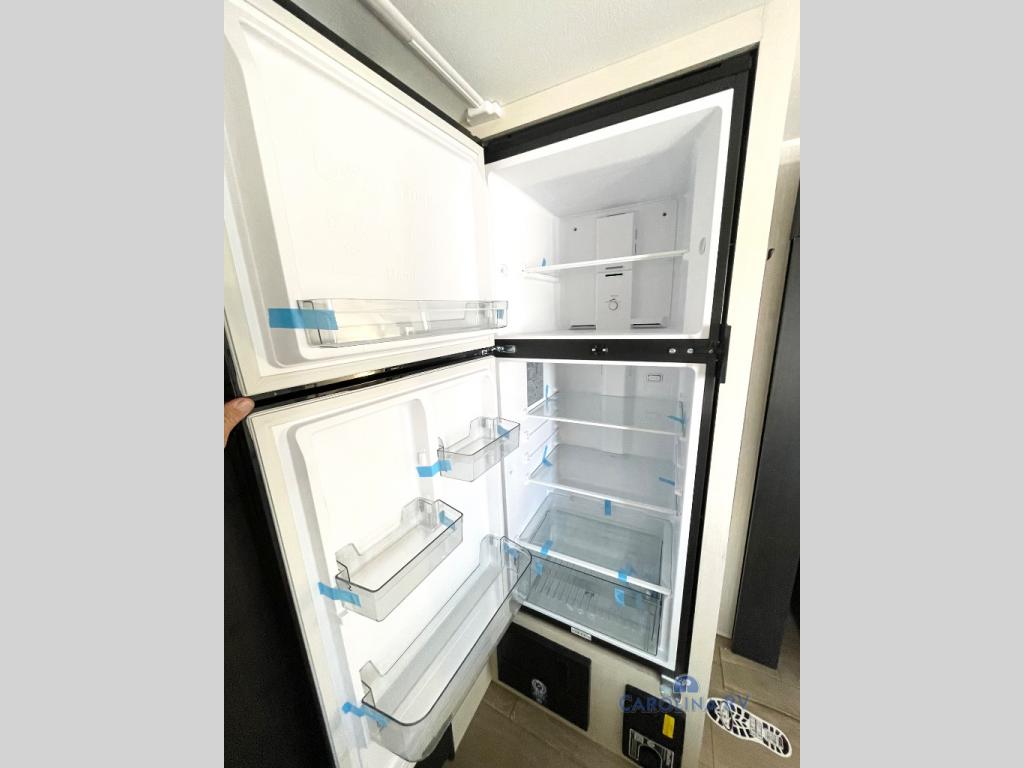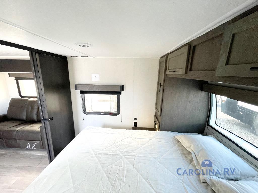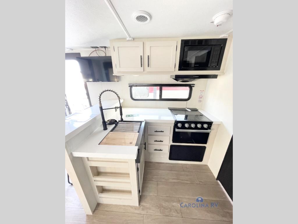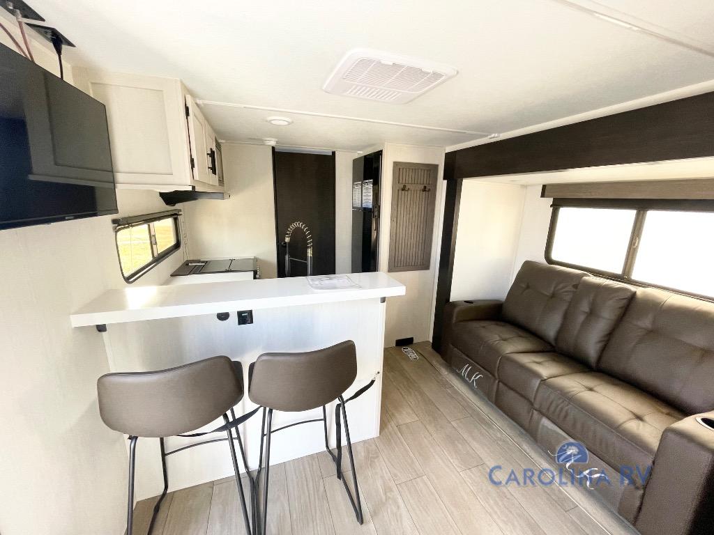 At the front of this travel trailer, a private bedroom with sliding doors offers a peaceful retreat, featuring a comfortable 60" x 80" queen bed and ample storage with dual wardrobes and overhead cabinets for all your essentials. Moving into the center, the living and kitchen area opens up with theater seating housed in a slide-out, creating a spacious feel and a cozy place to relax. Across from it sits the L-shaped kitchen, where solid-surface countertops, a three-burner range, microwave, and 10 cu. ft. refrigerator make meal prep quick and easy. The farm-style sink, complete with a cup washer and helpful accessories, adds both charm and convenience, while the bar top with chairs provides an ideal spot to dine or plan out your day’s adventures. At the rear, the full bathroom awaits with a generous linen closet, an ample shower, and a porcelain stool toilet so you can enjoy comfort and privacy without relying on campsite facilities.