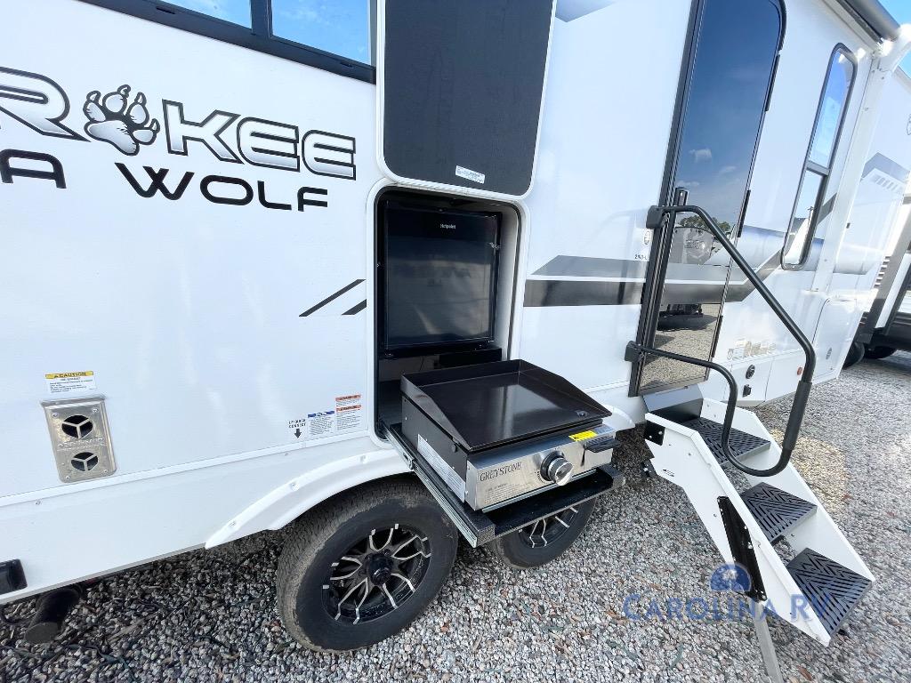 With any Cherokee Alpha Wolf travel trailer by Forest River, you'll enjoy outstanding amenities, quality construction, and an affordable price. Each model features a "ToughBend" rigid skirt metal design, 5/8" tongue and groove plywood floor decking, and a "SuperTruss" roof structure built for countless camping memories. There is a pet friendly "clean sweep" floor design with no heat vents indoors, along with a super lumen lighting system, a 15,000 BTU quick cool central air conditioning, and many more comforts. There are many convenient exterior features such as, Leash Latch pet safety technology, an outside shower with hot and cold water, and exterior steps with oversized landing and quick release. The Weather Guard Package will add protection against the elements with an armored underbelly tank enclosure and forced air heat, thermo-control reflective safety glass windows, and upgraded laminated exterior walls with block foam insulation!