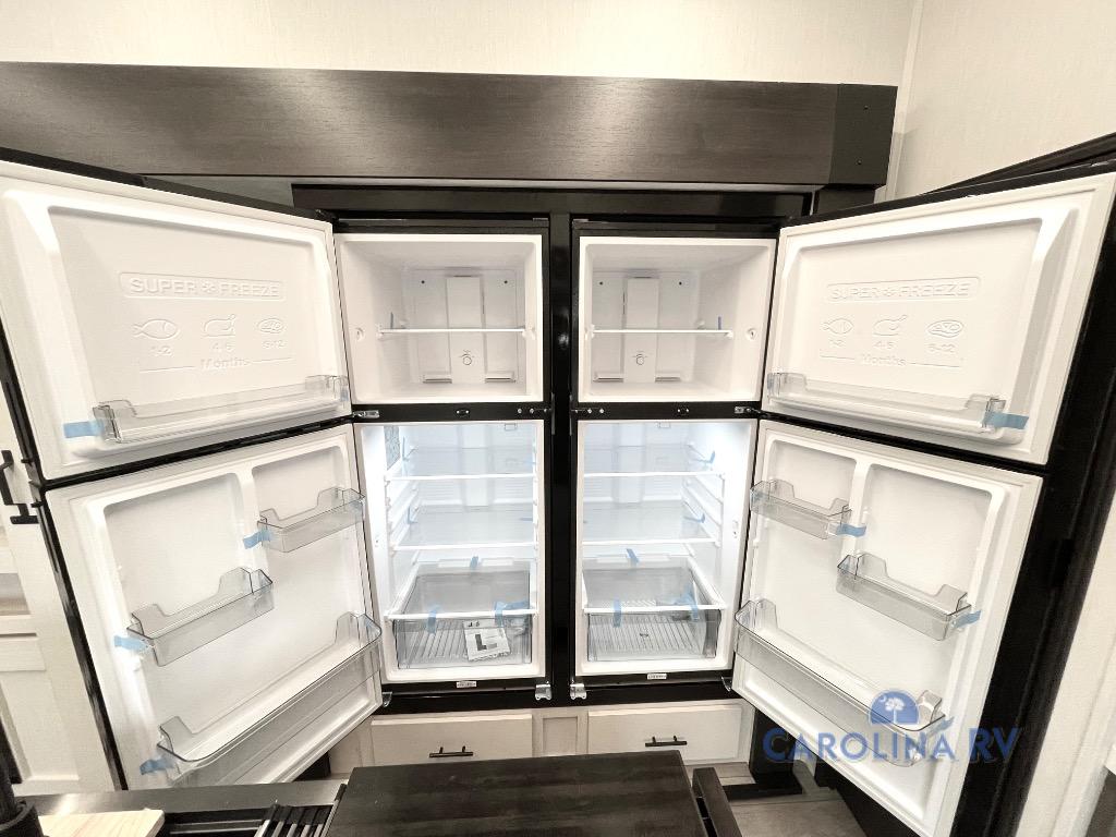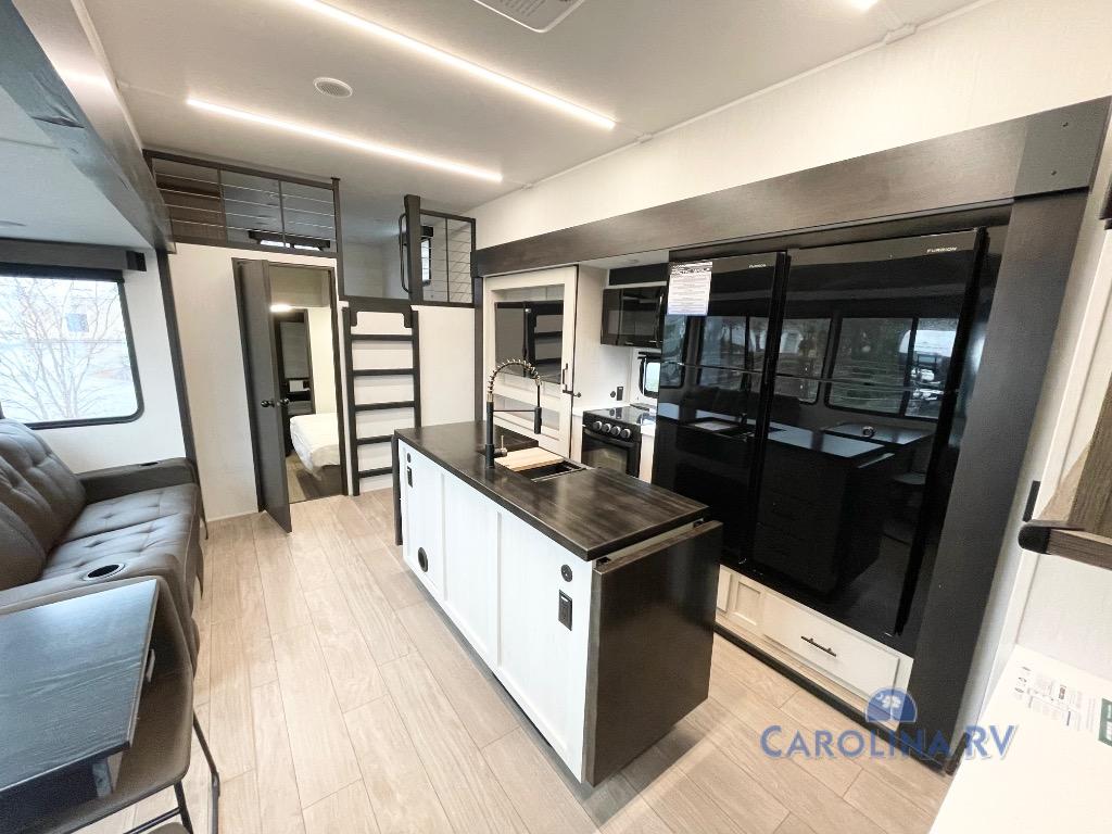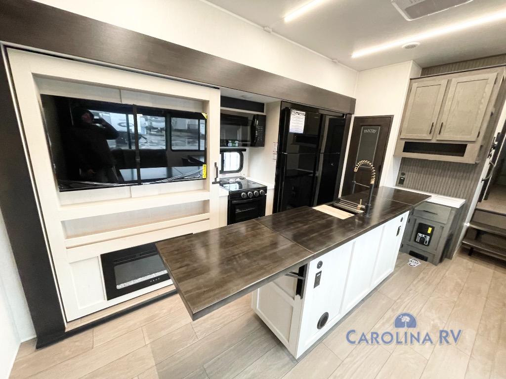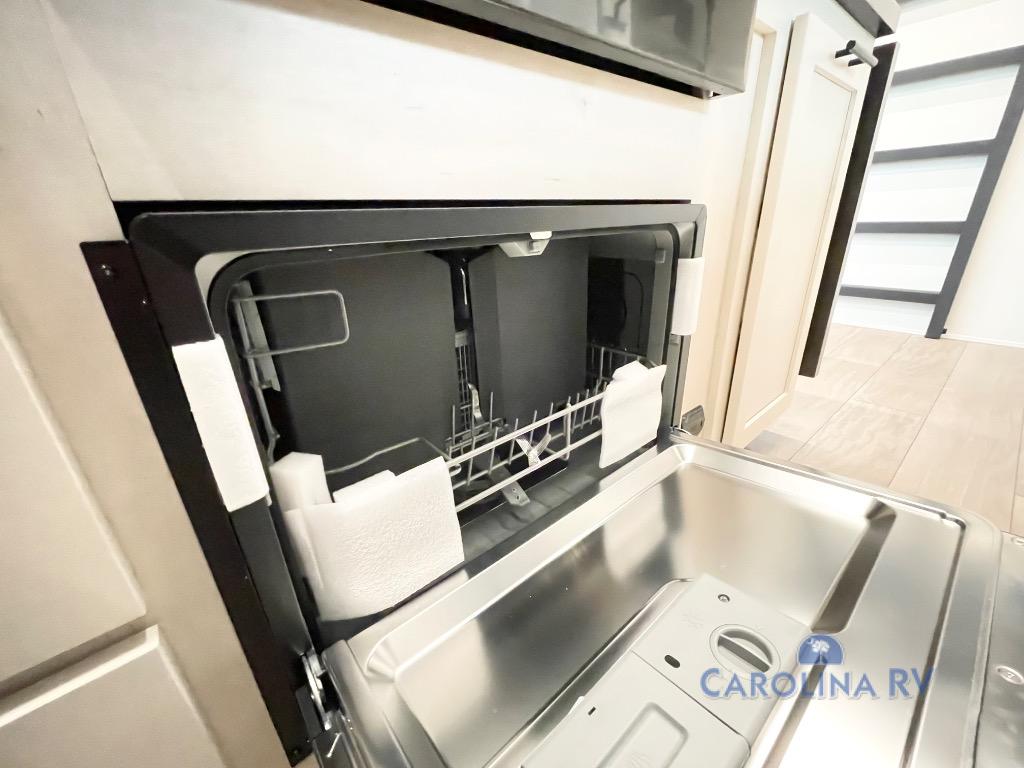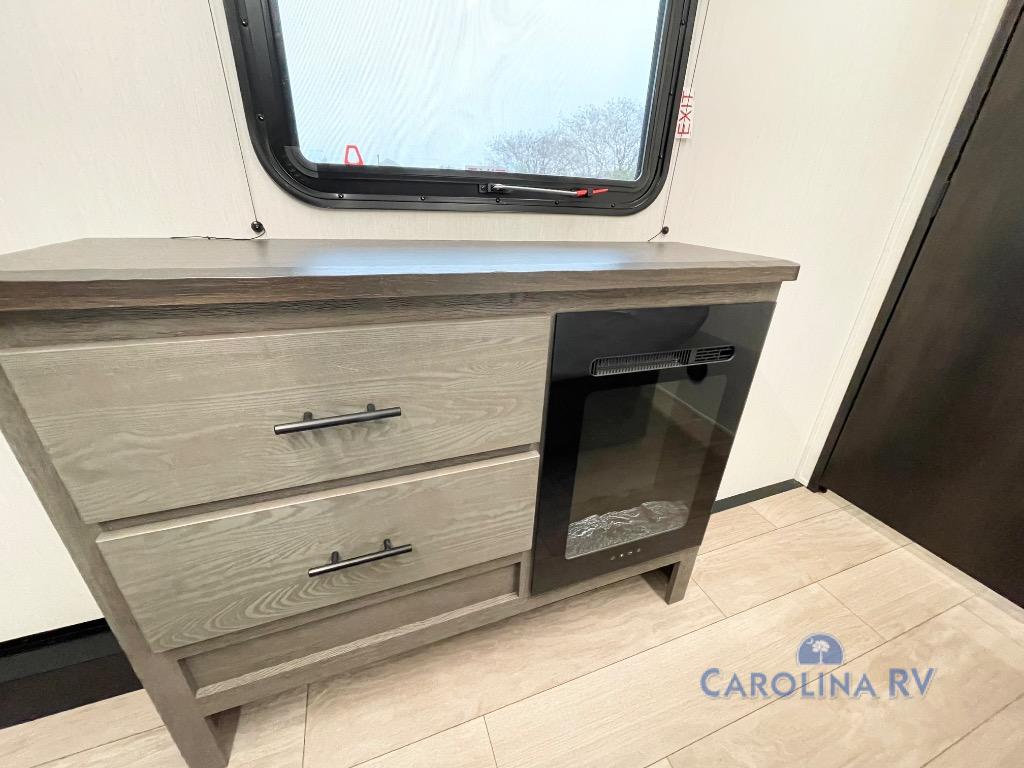 This quad-slide layout is set up for long stays and easy routines. The kitchen centers around a beautiful kitchen island for prep, the free-standing range is perfect for making full-size meals, and clean-up is a breeze with the built-in dishwasher. Across the living/kitchen zone you’ll find seating oriented to the entertainment wall and an LED TV, so movie nights don’t fight the cook space. Up front, the suite’s king bed slide faces a bedroom fireplace, with deep hanging space and drawers to keep wardrobes organized. Outside, the dual entry design improves campsite flow, and the triple-awning coverage stretches usable patio space. There is also more space for kids or guests in the upper loft!