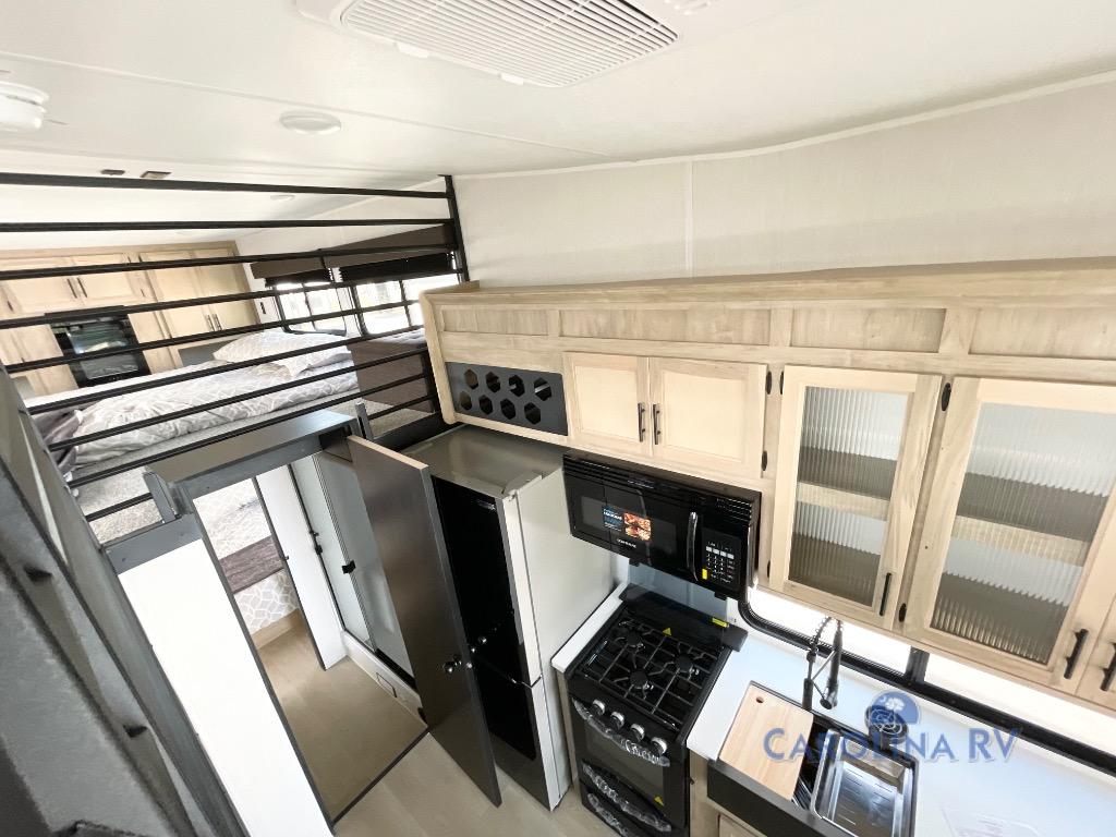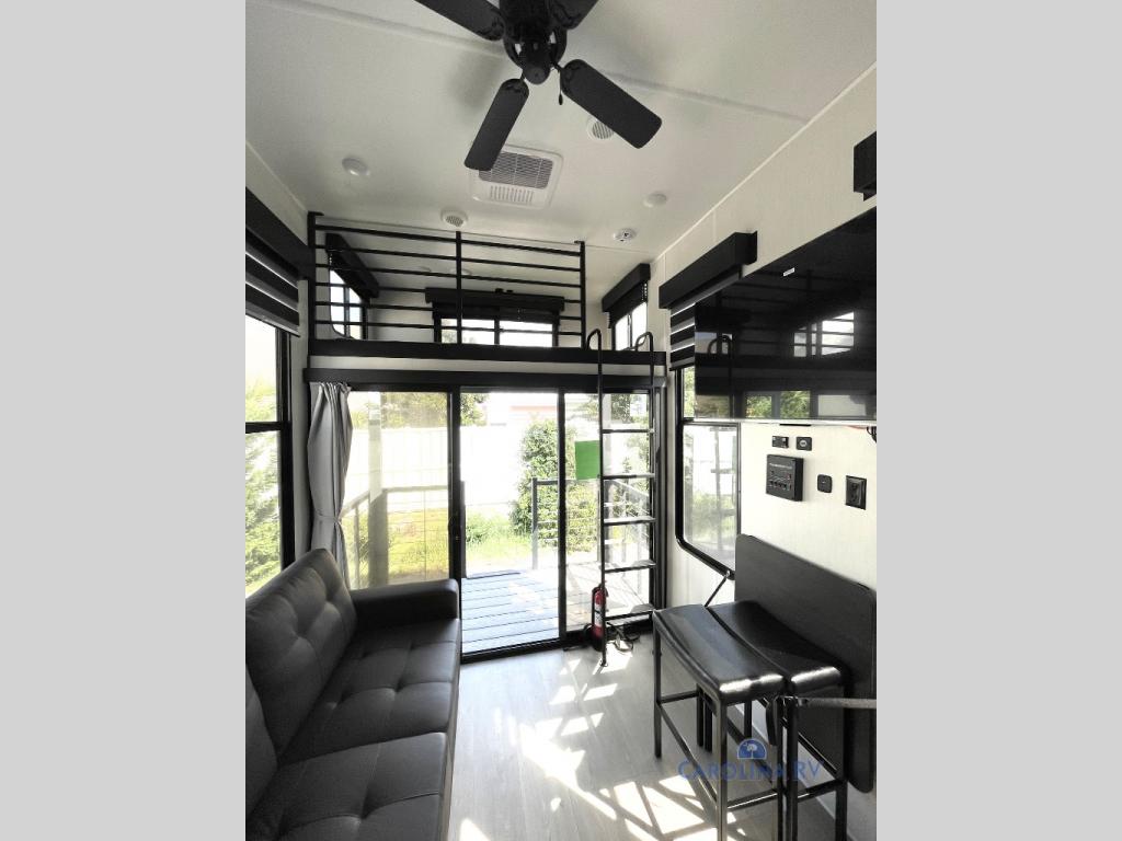 This model is similar to 16ML but larger! A bigger bathroom, king bed in the lower master, and a queen bed plus a twin bunk mat in the front loft. There is an 18 cu. ft. refrigerator so you can stock up for a week long vacation, a hide-a-bed sofa that can transform into added sleeping for guests, and a high top table with two stools to dine at. A ladder allows access into the upper front loft that is over the covered patio. The bathroom below is split with a shower on one side, and a private toilet area and sink opposite. And the view is amazing from just about anywhere inside.