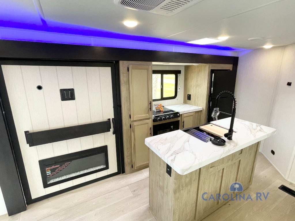 The whole gang will love this travel trailer with triple slides for more space. Your guests or the kids are sure to claim the rear private bunkhouse with a double bunk plus a flip-up bunk above a sofa and a TV mount if you want to add a television here. You'll have the front private bedroom with an RV king bed all to yourselves, and the full bath is close by for easy nighttime use. The middle combined kitchen and living area features dual opposing slides, a kitchen island, plus a U-shaped dinette and sofa. There is also an entertainment center with a fireplace and a hidden pantry behind for movies, snacks and more. Outside, two power awnings, exterior storage, and an outside kitchen makes it easier to spend more time outdoors!