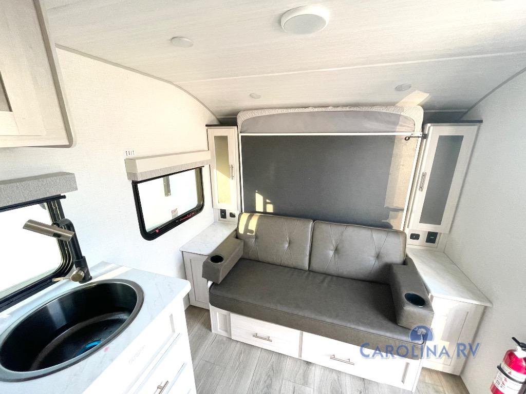 You're going to love all of the conveniences and versatility of this travel trailer! The front Murphy bed can fold away to reveal a sofa which gives you a comfortable place to sit during the day and to sleep at night too. The rear full bath features everything you will need to get squeaky clean each morning, as well as a large wardrobe for you to store your linens. After you have whipped up your best meal with the two-burner cooktop or convection microwave, you can head to the booth dinette and enjoy eating it there comfortably.