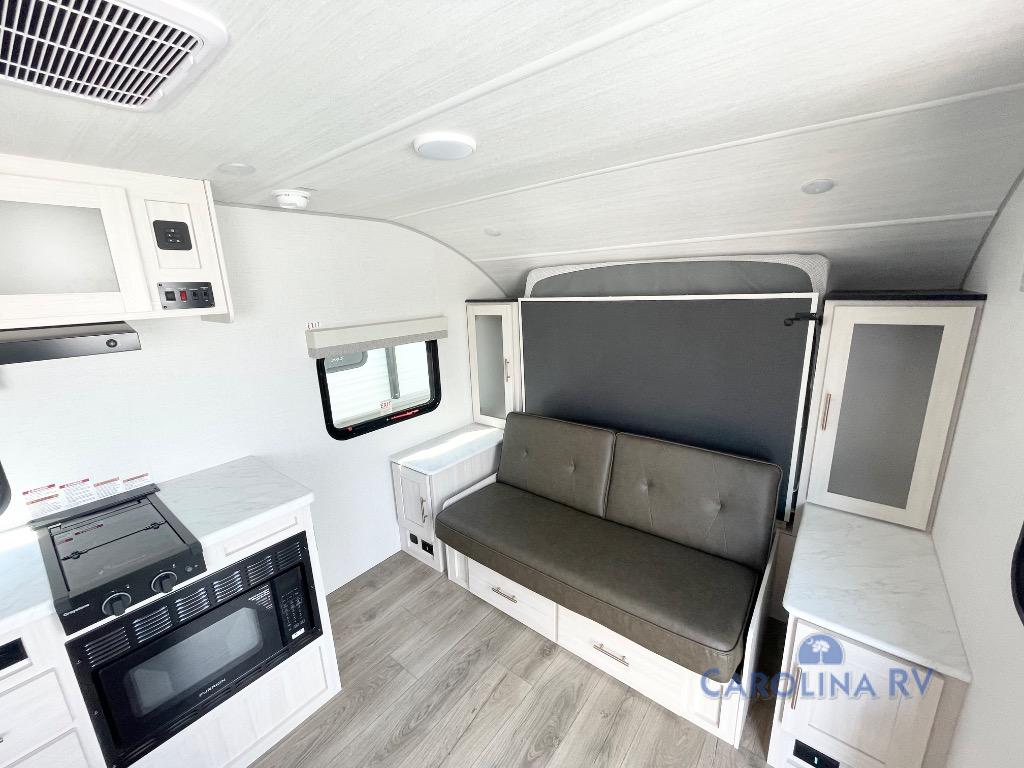 This versatile travel trailer is perfect for two adventure-seeking campers! You will love having a queen-size Murphy bed up front since you can fold it away during the day and relax on the sofa. There are also dual wardrobes to keep your clothes out of the way plus dual end end tables to set your coffee or book on. A full kitchen includes a convection microwave, 12V black glass refrigerator, and a counter with two chairs where you can dine each day. You will also love the flip-up window above the table, along with a 12V TV to keep you entertained, plus a pantry to keep food stocked. Head to the full rear bath that includes a large linen closet, a shower, and a night light for added convenience. The exterior is just as accommodating with its large roof mounted solar panel, rear accessory hitch, slam latch cargo doors, and more!