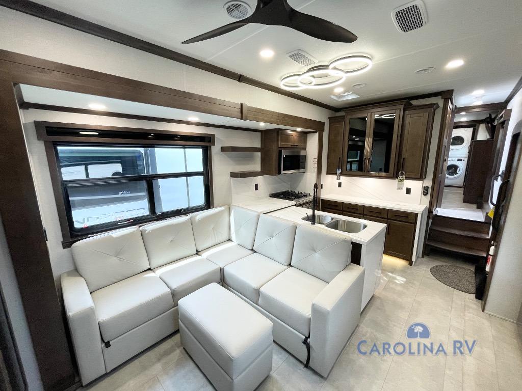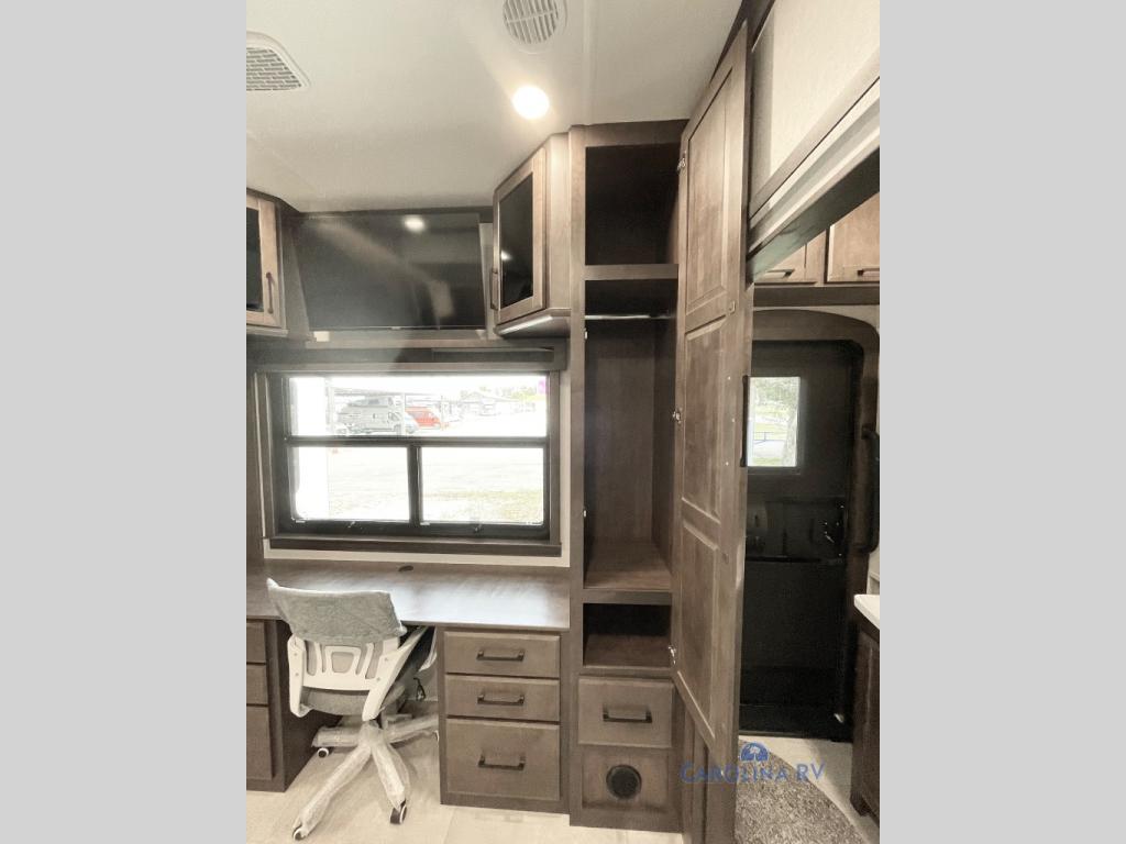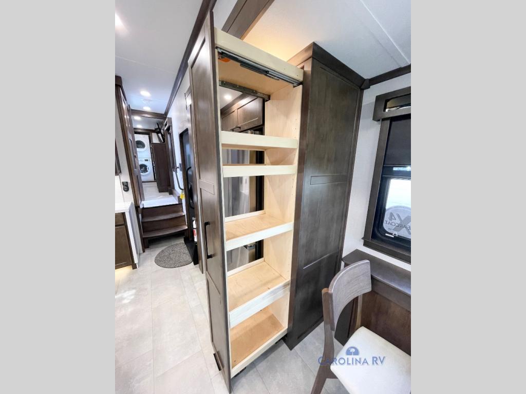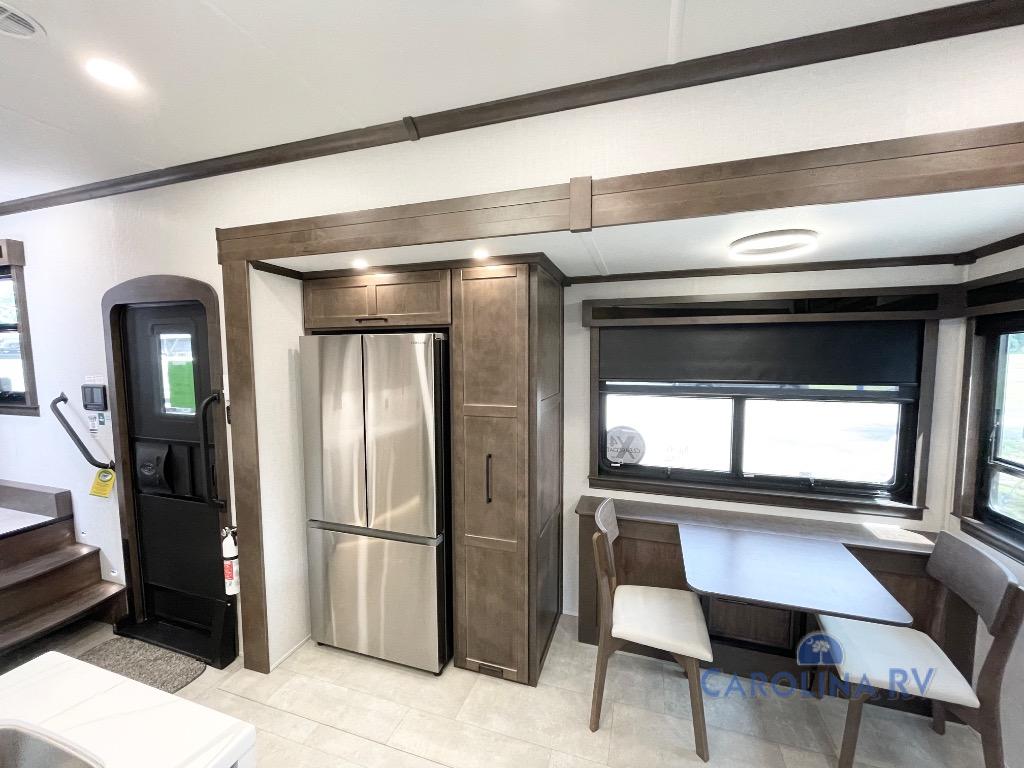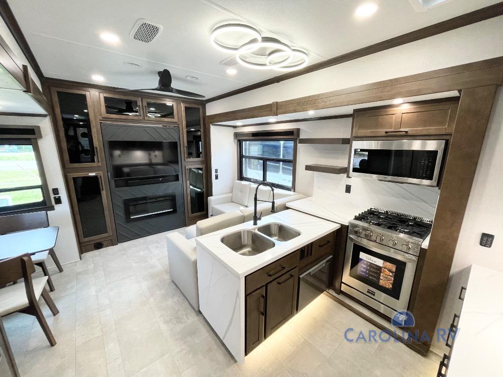 This is the perfect fifth wheel to travel with friends since there are two private bedrooms, one of which is a rear master with a full bath and its own exterior entry door. There is also a Murphy sofa here for your guests to sleep on, along with a wardrobe for their clothes and overhead storage. Head to the front private bedroom where you'll find a king bed slide, a dresser and a bench, a front wardrobe, plus a washer and dryer to make life at the campground easier than ever. The middle of this unit features the kitchen and living area. There is plenty of counter space plus a hutch and pantry for added storage. A sectional sofa provides tons of comfort, especially since its in perfect view of the fireplace and swinging entertainment center. There is also a dinette with four chairs where you can dine together and play a game of cards in the evening!