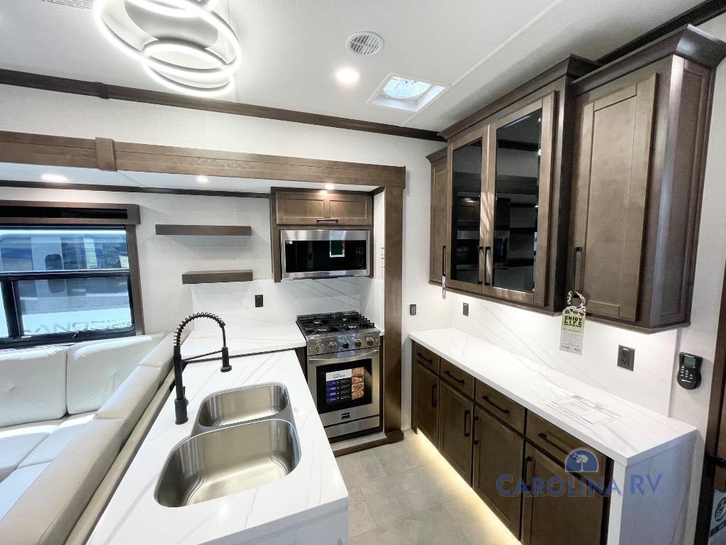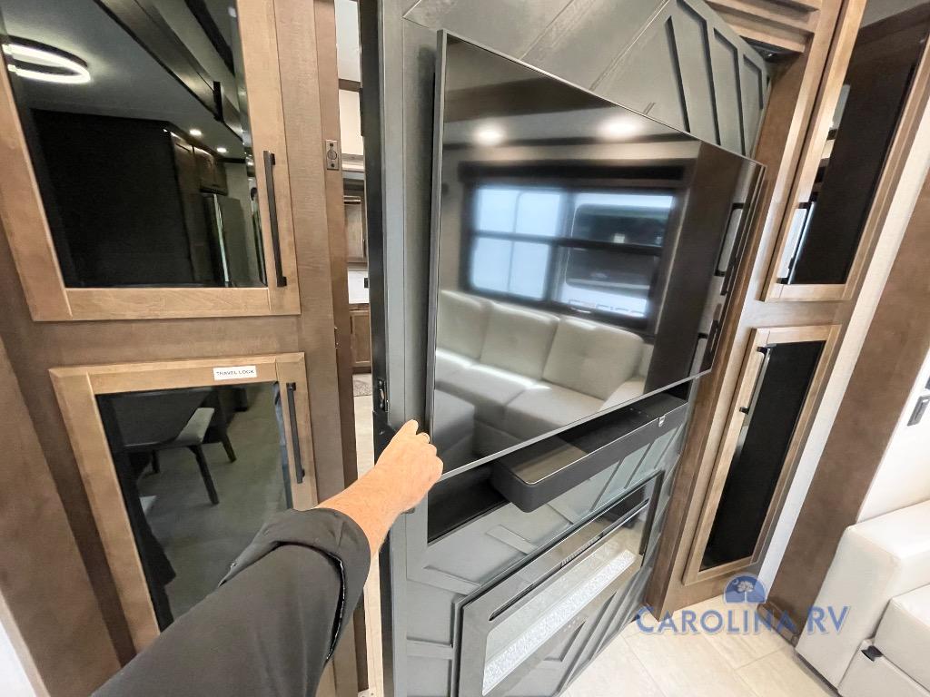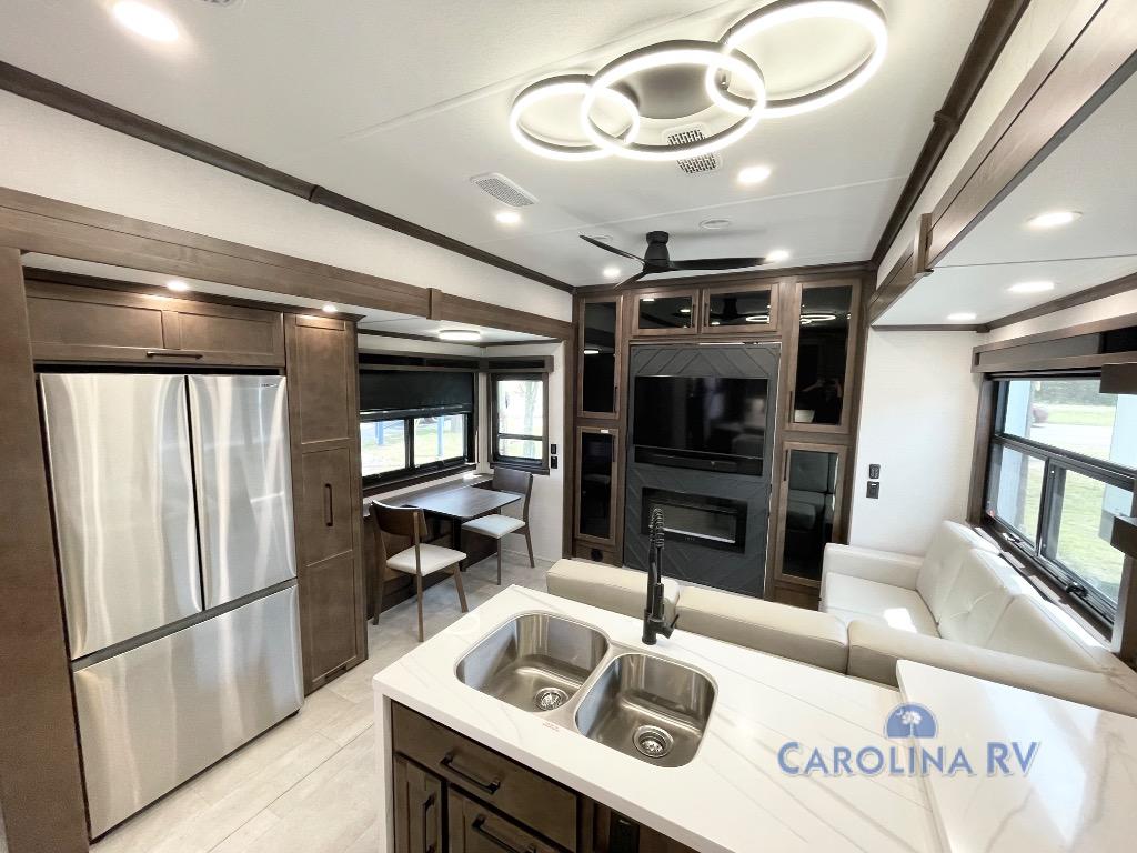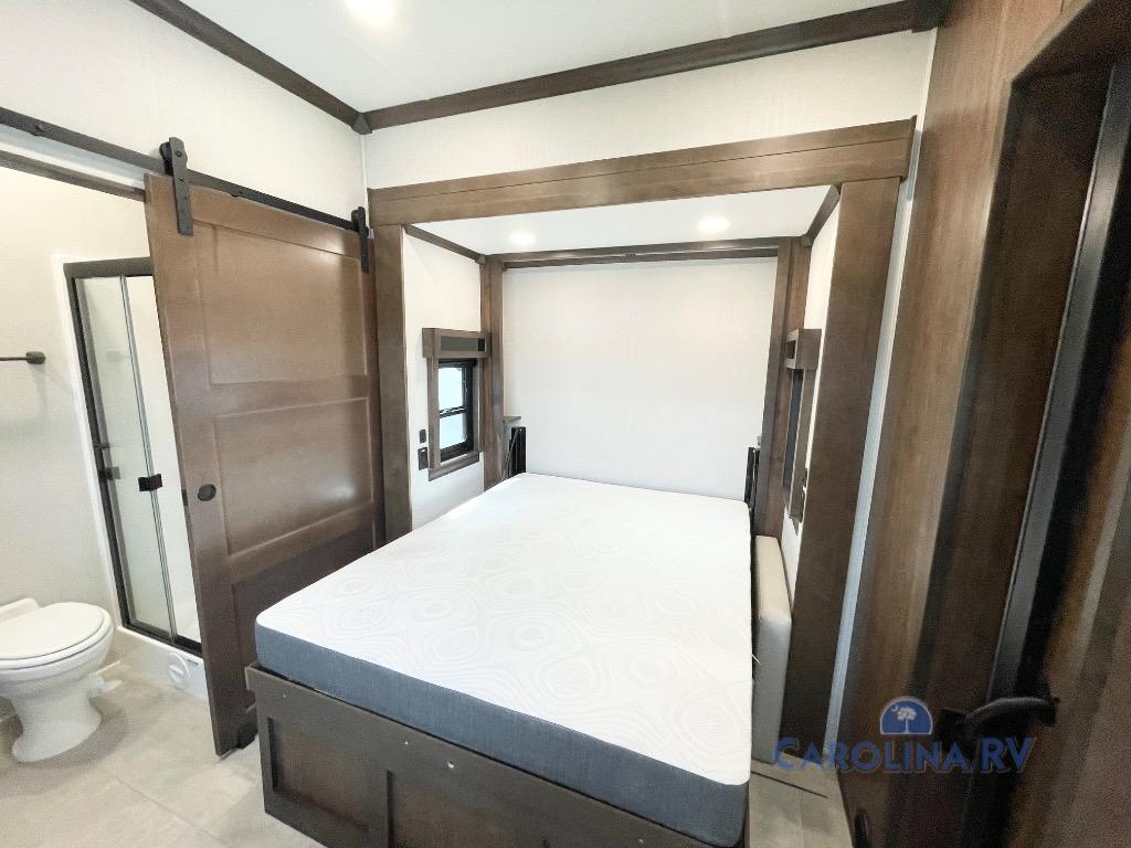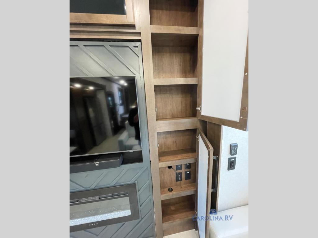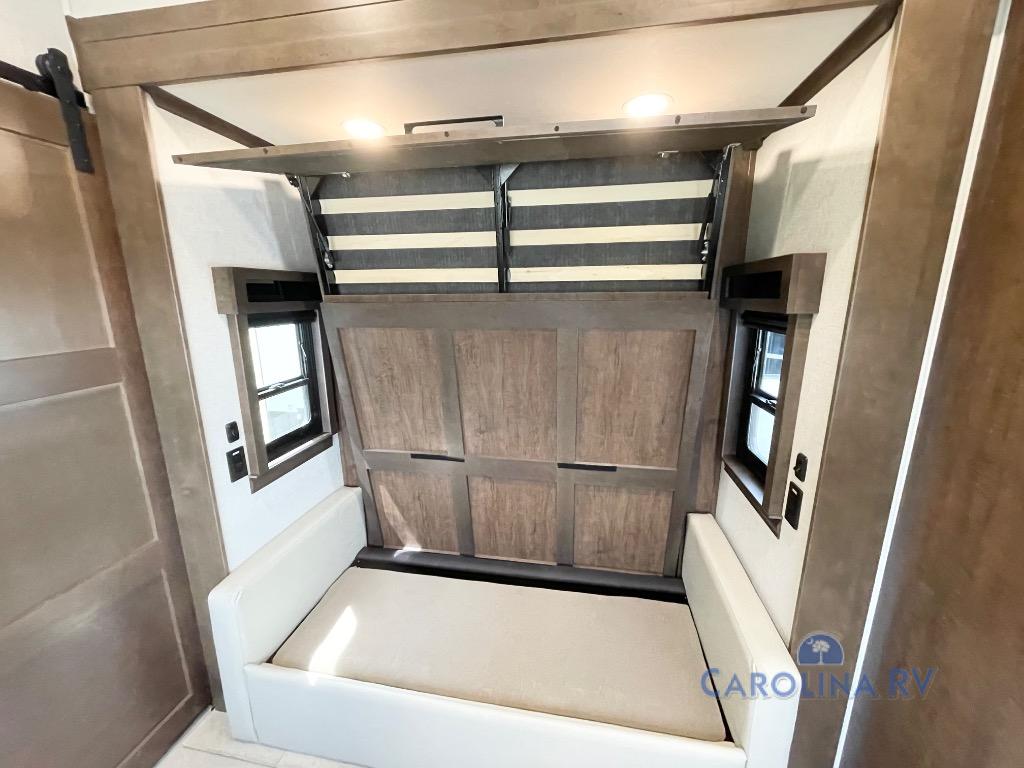 This is the perfect fifth wheel to travel with friends since there are two private bedrooms, one of which is a rear master with a full bath and its own exterior entry door. There is also a Murphy sofa here for your guests to sleep on, along with a wardrobe for their clothes and overhead storage. Head to the front private bedroom where you'll find a king bed slide, a dresser and a bench, a front wardrobe, plus a washer and dryer to make life at the campground easier than ever. The middle of this unit features the kitchen and living area. There is plenty of counter space plus a hutch and pantry for added storage. A sectional sofa provides tons of comfort, especially since its in perfect view of the fireplace and swinging entertainment center. There is also a dinette with four chairs where you can dine together and play a game of cards in the evening!