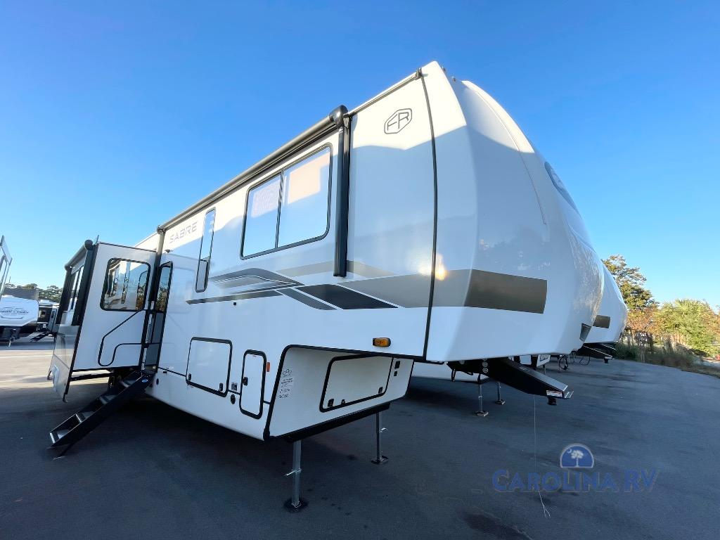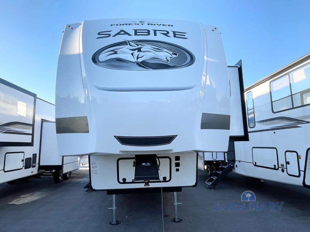You will experience luxurious camping trips at an affordable price with any one of these Forest River Sabre fifth wheels! These models are durable and ready to travel anytime of the year thanks to features like the high-gloss gel-coat front cap with LED lighting, the PVC roof membrane, and the forced air underbelly with enclosed gate valves. The electric auto-leveling system makes setting up easy and safe, and the adjustable power awning with LED lighting will create an inviting outdoor living space. Each model includes a universal docking station which includes a black tank flush and an outside shower, and adjustable stable steps for you to enter and exit the unit safely. Inside, you will love the design of the ambient accent lighting in the living area, the real wood lumbercore cabinetry, and the linoleum flooring!