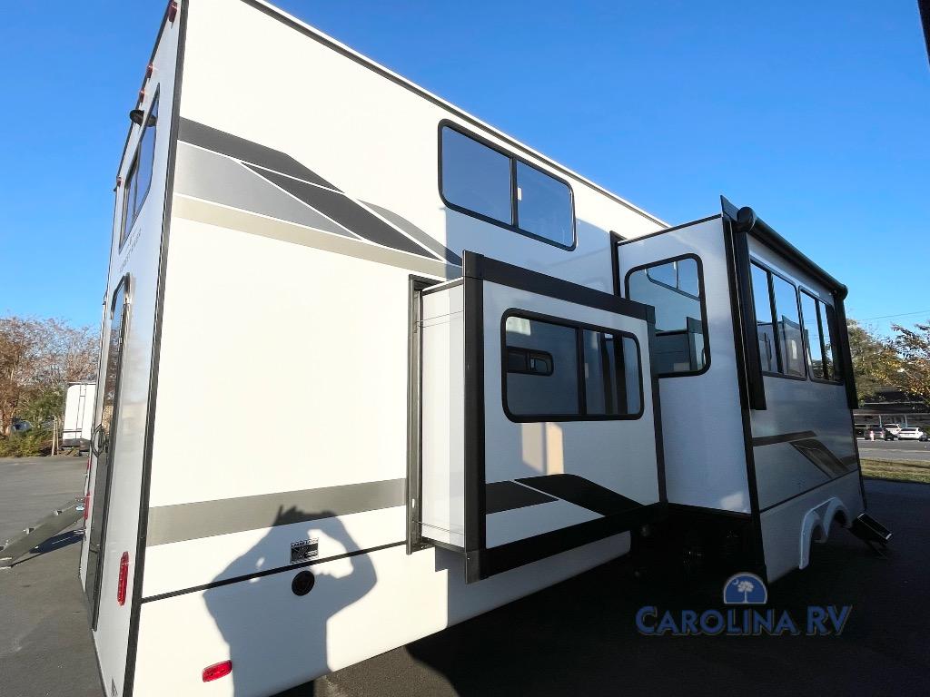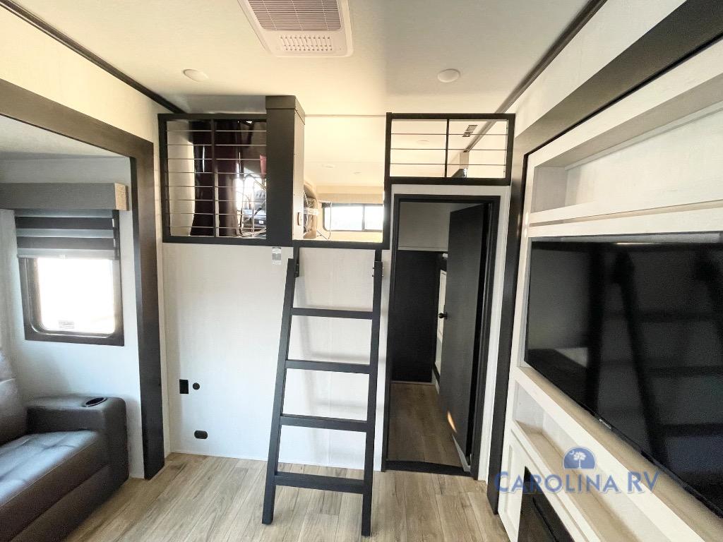 Are you looking for a fifth wheel where you can bring along your neighbor friends? You can do just that since there are two bedrooms in this unit, one of which includes a master bath with its own exterior entry door! The front bedroom is right next to the second full bath for convenience, and includes a camper king bed slide, a dresser, and front wardrobe. The rear master bedroom has a queen bed slide out across from a second slide for more floor space, and there is a loft above this room for more sleeping or storage space. Everyone can meet in the middle kitchen and living room since there are recliners, a ceiling fan, and kitchen island with four chairs. There is also storage below the island for kitchen necessities, and the hidden pantry behind the TV will be perfect for snacks, board games and more!