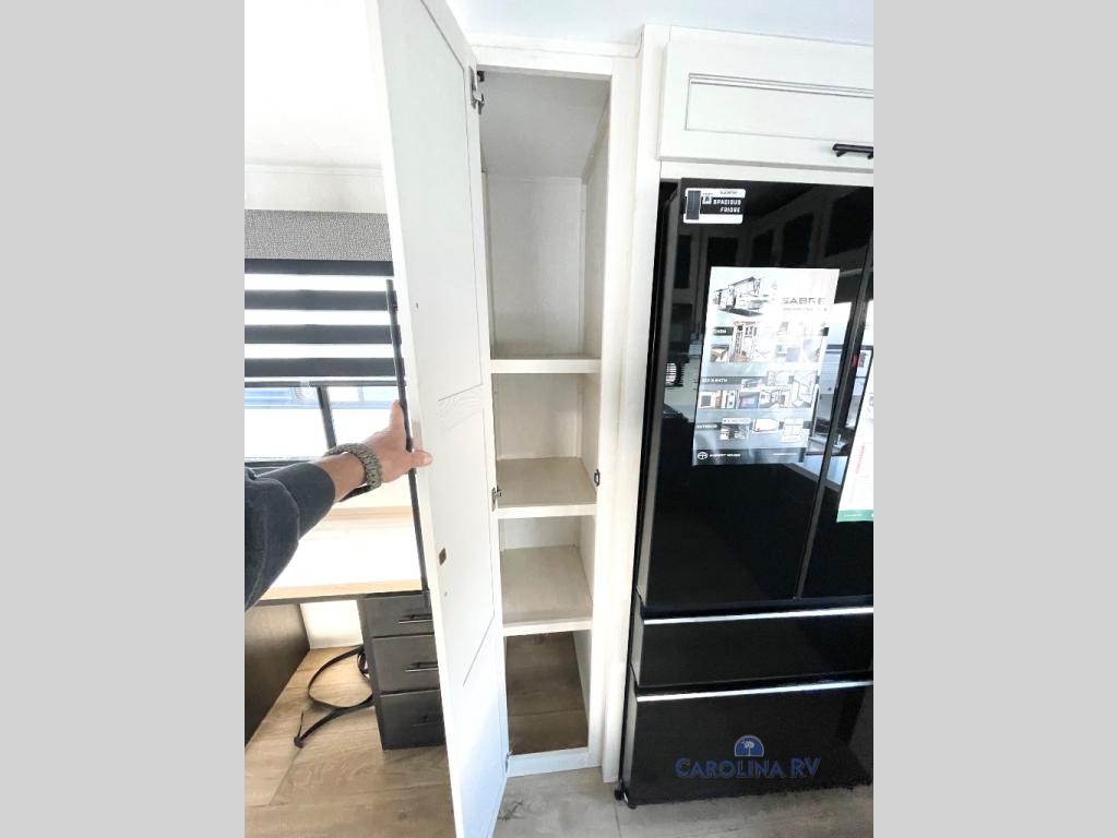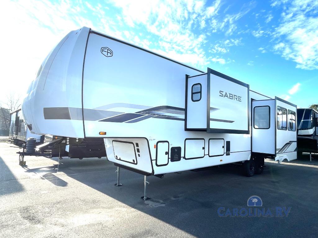 You will experience luxurious camping trips at an affordable price with any one of these Forest River Sabre fifth wheels! These models are durable and ready to travel anytime of the year thanks to features like the high-gloss gel-coat front cap with LED lighting, the PVC roof membrane, and the forced air underbelly with enclosed gate valves. The electric auto-leveling system makes setting up easy and safe, and the adjustable power awning with LED lighting will create an inviting outdoor living space. Each model includes a universal docking station which includes a black tank flush and an outside shower, and adjustable stable steps for you to enter and exit the unit safely. Inside, you will love the design of the ambient accent lighting in the living area, the real wood lumbercore cabinetry, and the linoleum flooring!