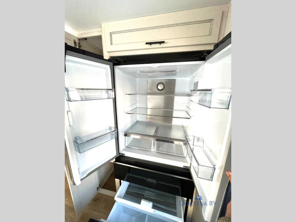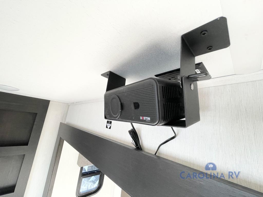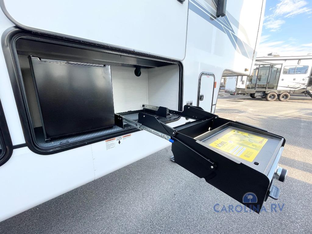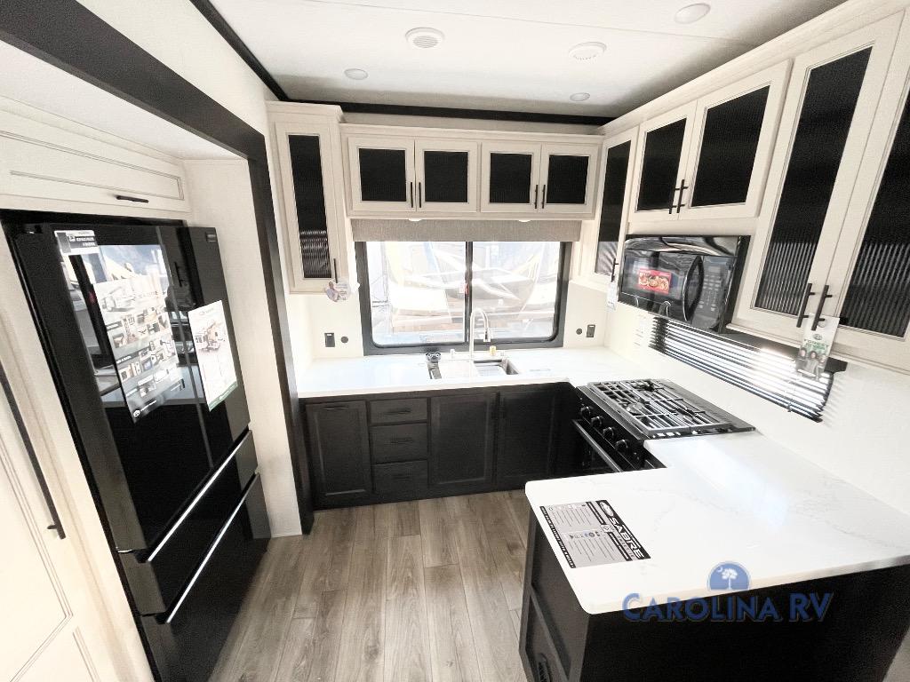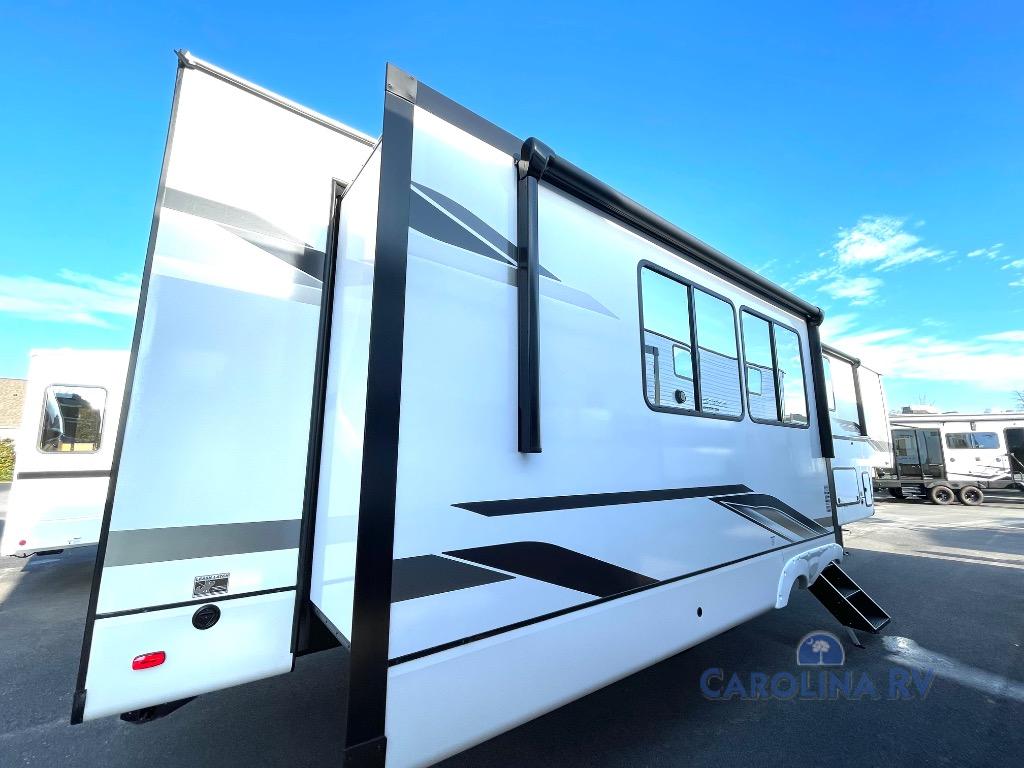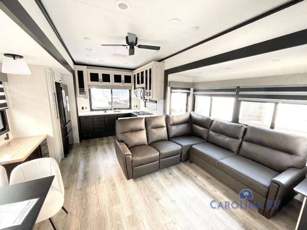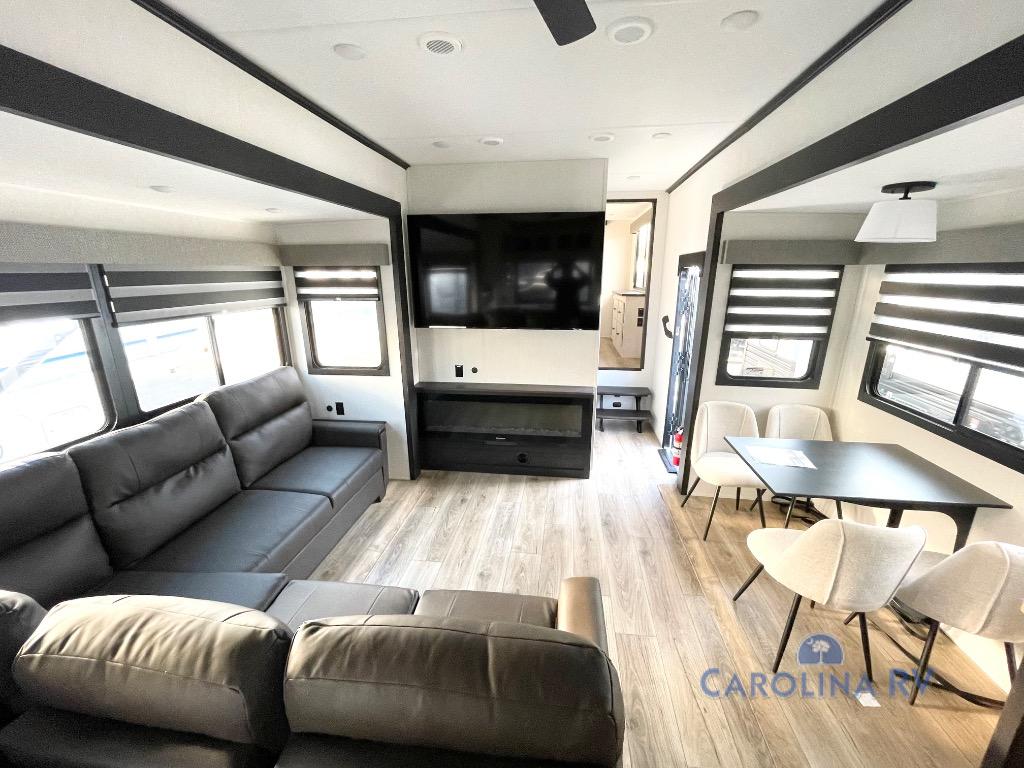 Get ready to elevate your travels to new heights with this show-stopping fifth wheel, designed for thrill-seekers. The rear kitchen is a culinary powerhouse, featuring a spacious layout, overhead cabinets, ample countertop, three-burner cooktop, microwave, oversized fridge, and pantry. In the living area section, the sectional sofa creates a warm and inviting space, perfect for socializing, relaxing, and making memories. The fireplace crackles with warmth, while the entertainment center provides endless entertainment options. Also, the dinette is a charming spot for meals, laughter, and storytelling. Unwind and recharge in style, with plenty of room to get ready for the day ahead, thanks to the full bath with dual sinks, ample dresser space, and a half-bath in the middle of this unit for added convenience. Moving to the main bedroom, the camper king bed is perfect for a restful night's sleep, and the dresser with hidden storage keeps your belongings organized, while the projector above the dresser adds a touch of magic to movie nights.