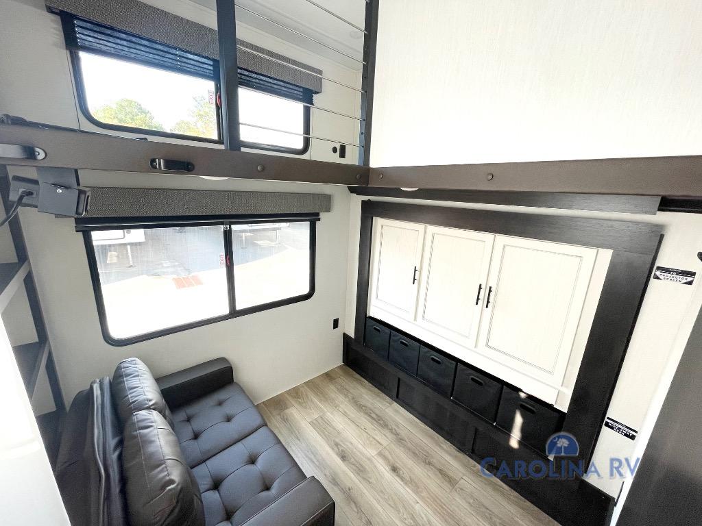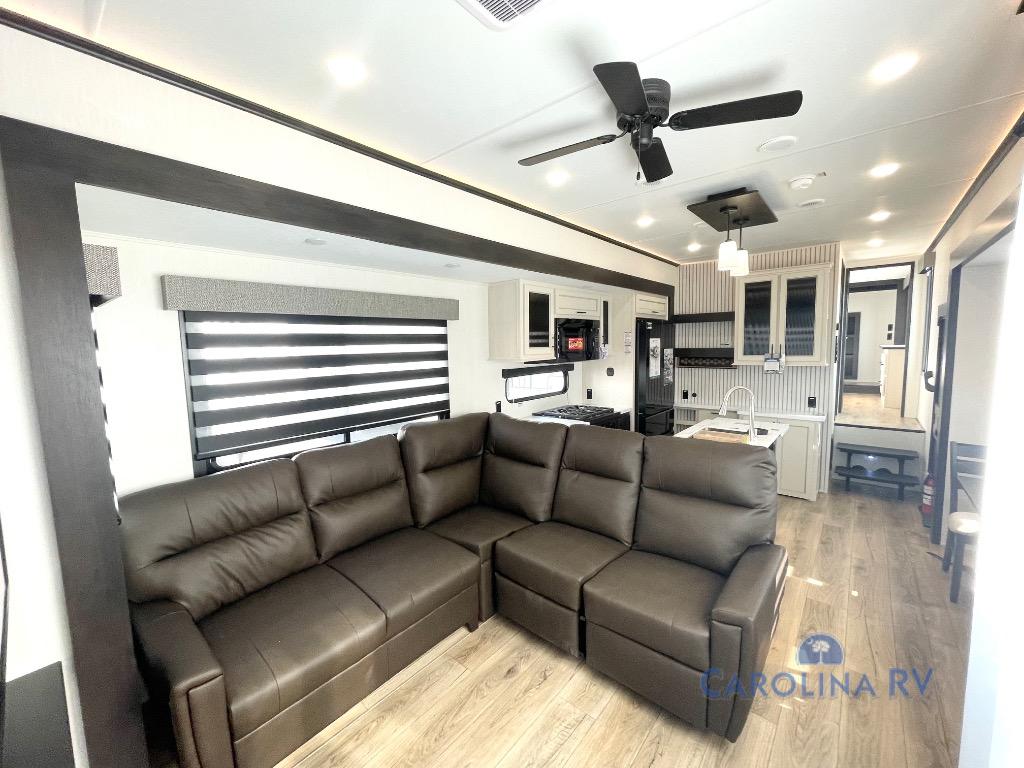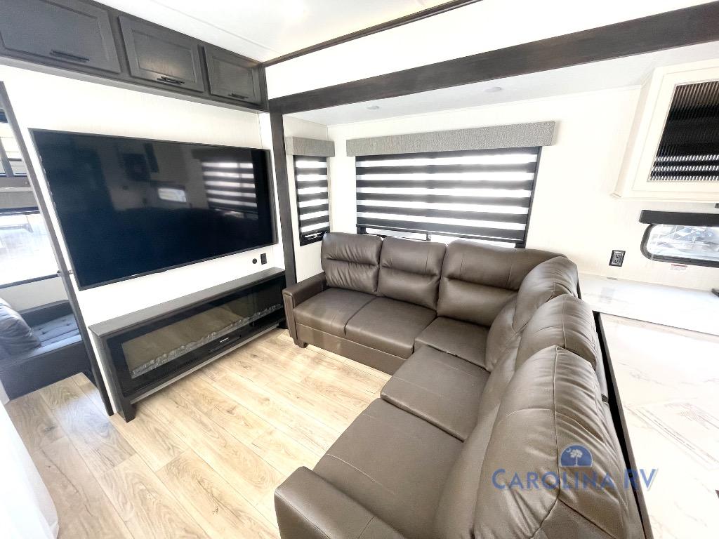 This is the perfect fifth wheel if you enjoy camping with friends and family! You'll have the front private bedroom with a camper king bed slide all to yourselves, while your guests take the rear den. There is a tri-fold sofa here, along with a wardrobe with a desk, additional shelves plus a loft above this room for even more sleeping or storage space! The main living room features an L-shaped sectional sofa, a fireplace and an entertainment center. And the patio deck with a 12' awning is right off of this room so you can visit with friends indoors or outdoors! There is generous counter space in the full kitchen, along with a pull-out storage drawer and a versatile dinette/desk. There are many more stand-out features found in this fifth wheel, including washer and dryer prep in the front bedroom, a 70" projector screen in the rear den, a second power awning, and the list goes on!