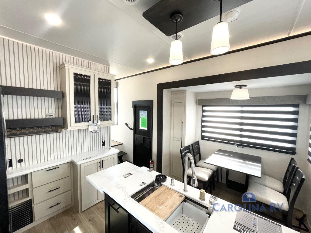 You will experience luxurious camping trips at an affordable price with any one of these Forest River Sabre fifth wheels! These models are durable and ready to travel anytime of the year thanks to features like the high-gloss gel-coat front cap with LED lighting, the PVC roof membrane, and the forced air underbelly with enclosed gate valves. The electric auto-leveling system makes setting up easy and safe, and the adjustable power awning with LED lighting will create an inviting outdoor living space. Each model includes a universal docking station which includes a black tank flush and an outside shower, and adjustable stable steps for you to enter and exit the unit safely. Inside, you will love the design of the ambient accent lighting in the living area, the real wood lumbercore cabinetry, and the linoleum flooring!