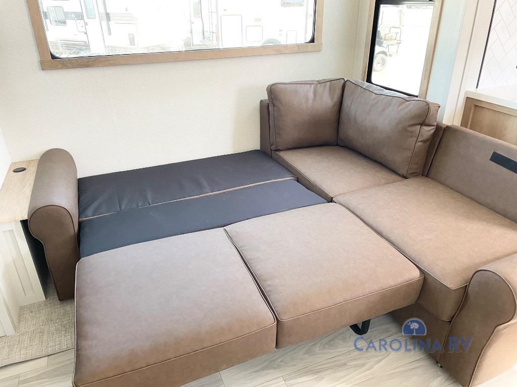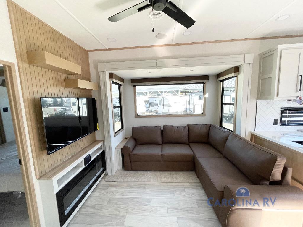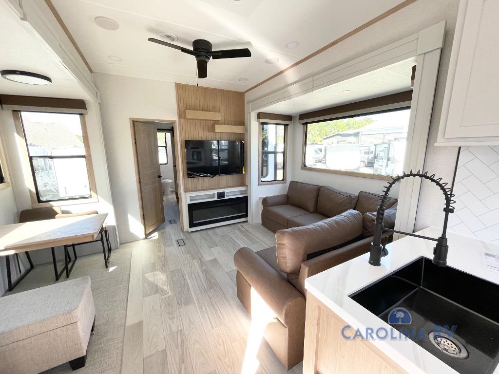 This fifth wheel is thoughtfully designed for comfort and convenience, starting with a spacious front bunkhouse perfect for accommodating guests. It features two flip-up bunks, 28" x 74" and 32" x 74" and a 60" x 74" fold-out lounge, along with a wardrobe, dresser, and additional storage to keep essentials organized. A nearby half bath adds easy access and extra convenience. At the center of the unit, the kitchen offers everything you need to prepare meals, including a stainless-steel sink, three-burner cooktop, and a generous 16 cu. ft. refrigerator. Meals can be enjoyed at the free-standing dinette, or you can unwind on the sectional sofa while enjoying the fireplace or entertainment center. At the rear, you'll find the private main bedroom with a roomy 66" x 80" RV king bed, plus its own wardrobe and dresser. Just steps away is the full bathroom featuring a one-piece fiberglass shower, sink with medicine cabinet, linen storage, and even washer/dryer prep for extended stays.