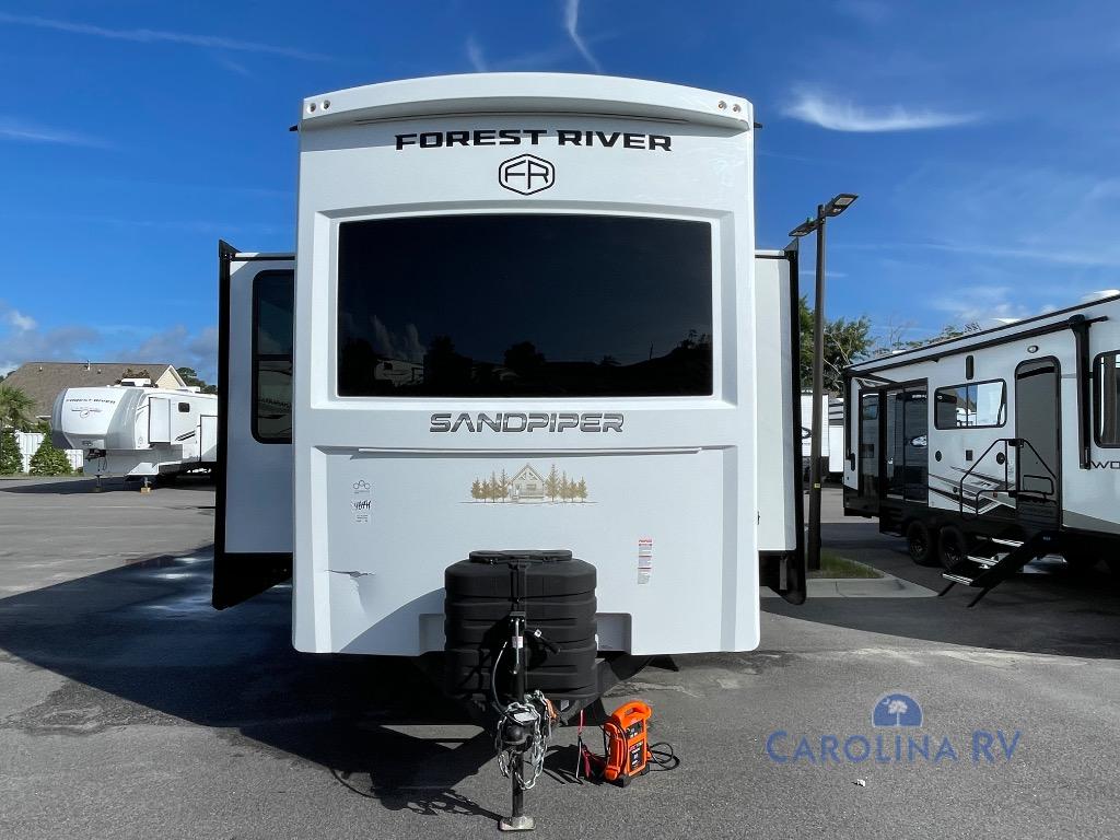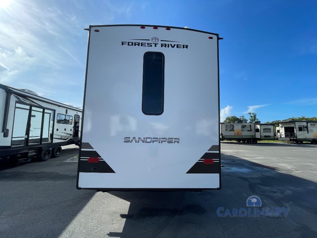 With each Sandpiper Destination Trailer by Forest River you will enjoy many luxurious features, such as crown molding over the kitchen cabinets, solid surface kitchen countertops, a memory foam mattress, plus so much more. The extra large picture windows throughout let natural light in and provide beautiful outdoor views, and each model includes three or more slides for added interior space. You'll find many exterior conveniences, like the porch light with an interior switch, the rain gutters with extra long drip spouts to prevent black streaking, and an electric awning with LED light strip, plus more! You will stay comfortable year around with dual 15,000 A/C units plus each model is constructed with an Underbelly Armor for better protection and insulation!