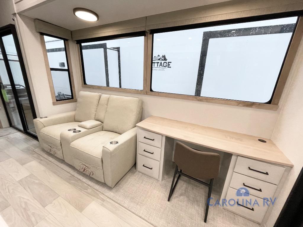 One look at this destination trailer and you'll be sold! You'll love waking up each morning in the master bedroom with a king bed slide out, dual nightstands, and a dresser to keep clothes organized. There is also a spacious front bathroom with a walk-in closet! As you walk to the main living area, you'll find the half bath with washer and dryer prep if you plan to add these appliances. A tri-fold hide-a-bed sofa and theater seating in the living area will let you relax each day, and the bar with stools overlooks the kitchen so you can visit with the chef while dinner is being made.