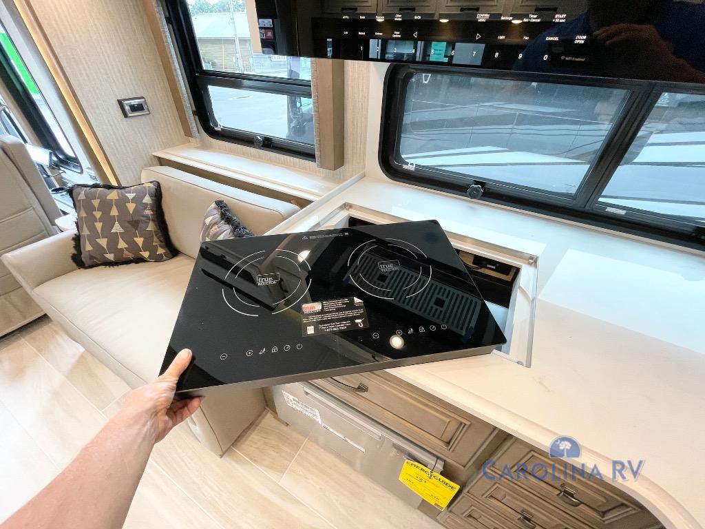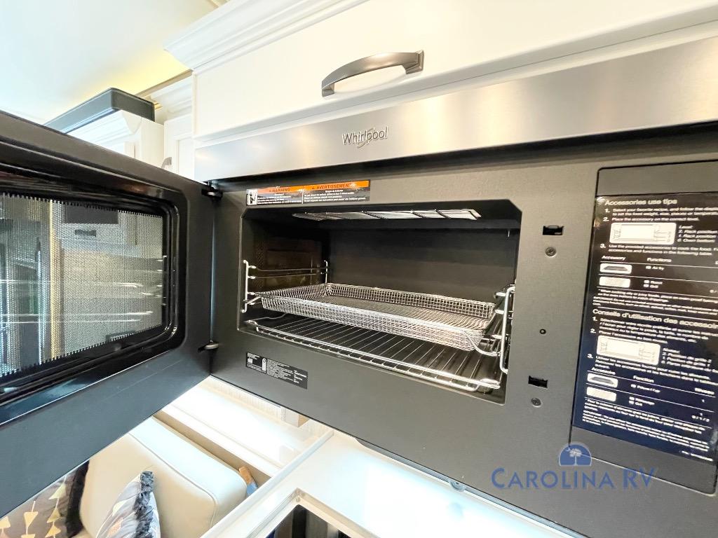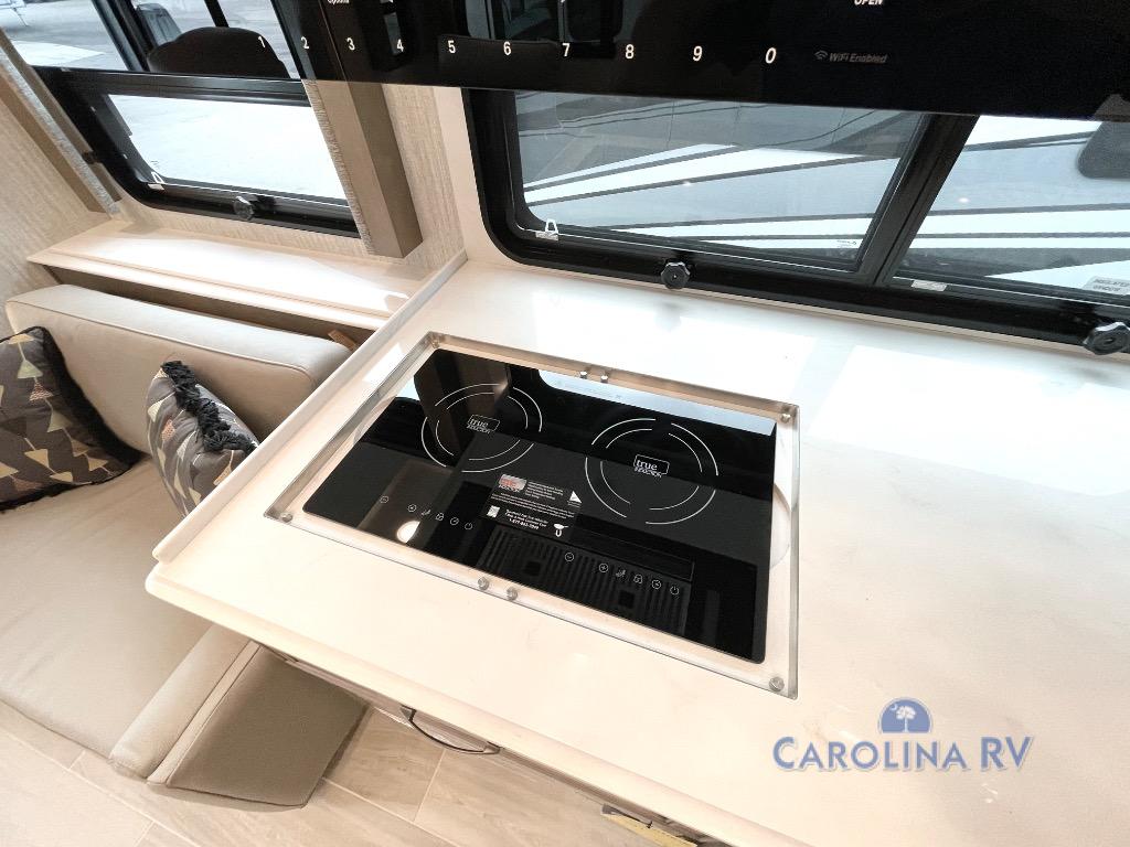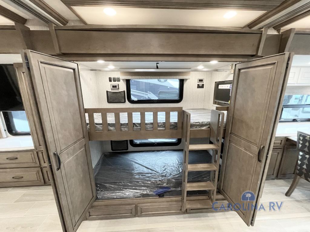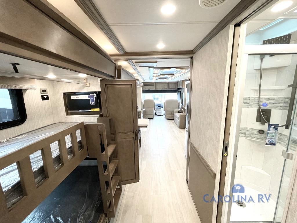 The whole family will love traveling in this coach with a full-wall slide and two additional slides for more space! The bunk beds with drawers below are right across from the mid-ship full bath, and there is a second full bath in the back. Here, you'll find a spacious 50" x 30" shower with a seat, a wardrobe with shelves, plus a second wardrobe with washer and dryer prep. Your crew can relax each day at the hide-a-bed sofa, the love seat, or the hide-a-leaf dinette while the chef of your group cooks in the full kitchen. An all-electric flush mount induction cooktop comes standard, along with a stainless steel convection microwave with an air fryer feature, plus a 19.7 cu. ft. Whirlpool refrigerator and a pantry for ample food storage. This model sits on a Freightliner tag axle chassis with an optional Spartan K2 tag axle chassis; see dealer for more details!