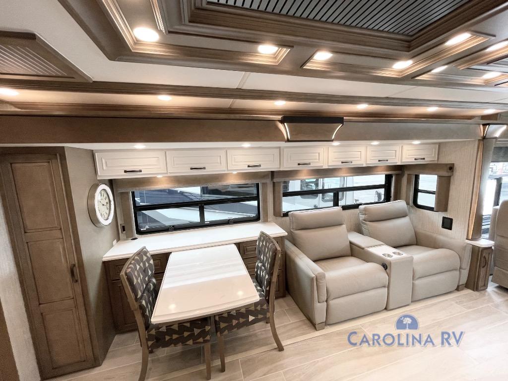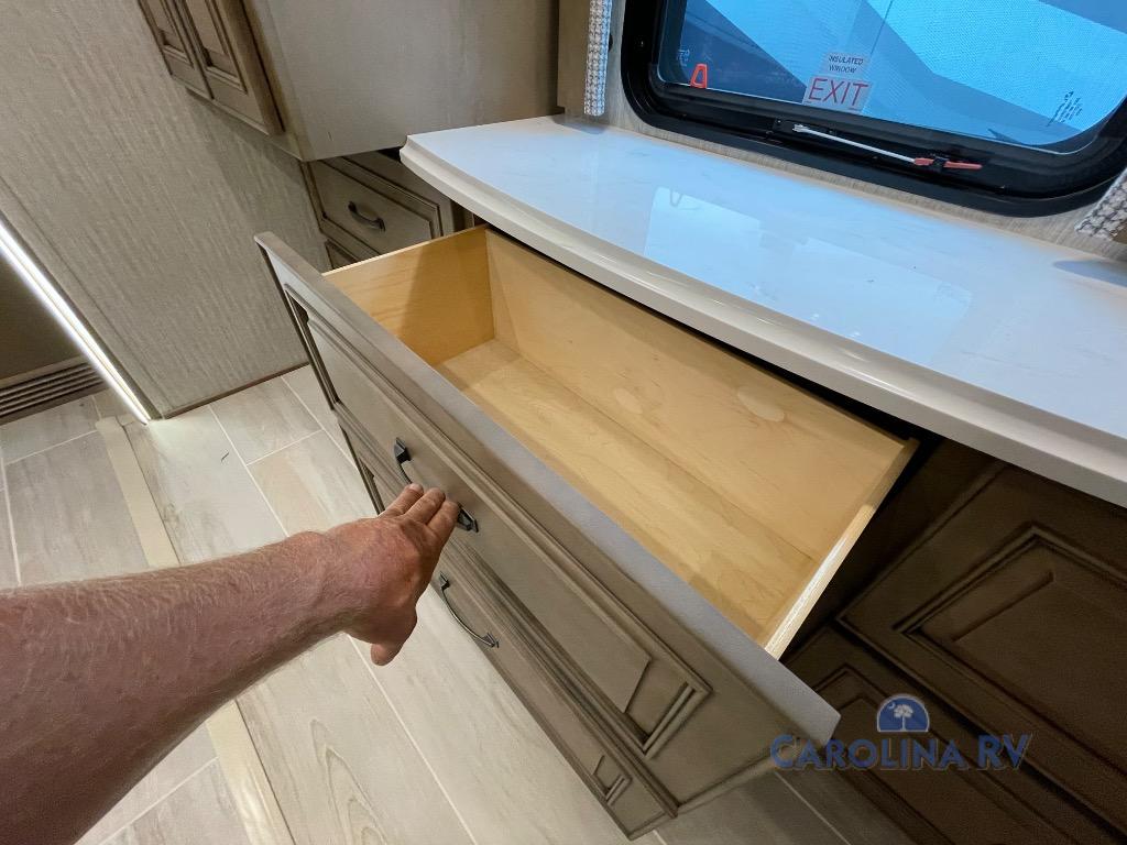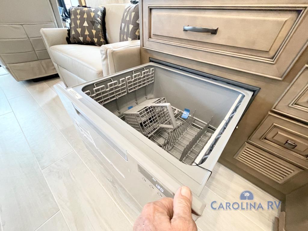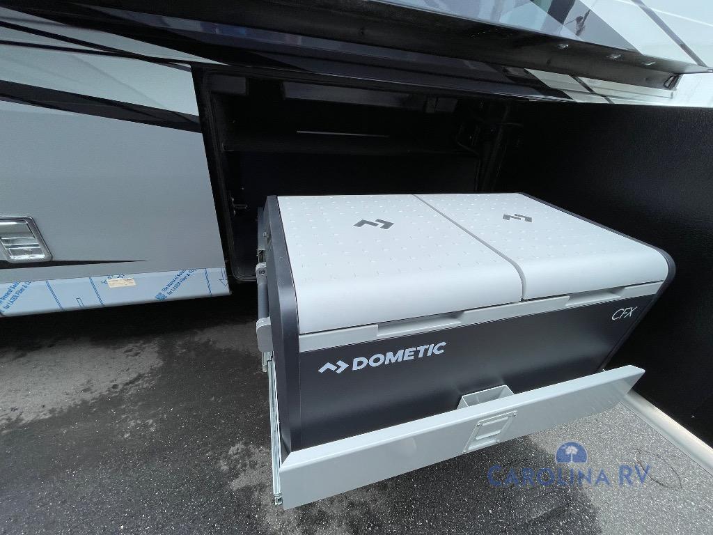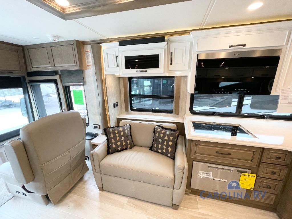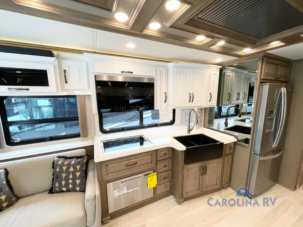 The whole family will love traveling in this coach with a full-wall slide and two additional slides for more space! The bunk beds with drawers below are right across from the mid-ship full bath, and there is a second full bath in the back. Here, you'll find a spacious 50" x 30" shower with a seat, a wardrobe with shelves, plus a second wardrobe with washer and dryer prep. Your crew can relax each day at the hide-a-bed sofa, the love seat, or the hide-a-leaf dinette while the chef of your group cooks in the full kitchen. An all-electric flush mount induction cooktop comes standard, along with a stainless steel convection microwave with an air fryer feature, plus a 19.7 cu. ft. Whirlpool refrigerator and a pantry for ample food storage. This model sits on a Freightliner tag axle chassis with an optional Spartan K2 tag axle chassis; see dealer for more details!