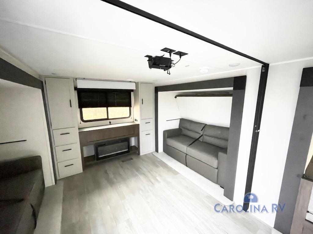 The whole gang will love camping in this spacious travel trailer that can sleep nine to ten people! The rear bunkhouse features dual opposing slides with hide-a-bed sofas and hinged bunk beds, plus a hidden desk, fireplace, and projector for movie nights! You'll appreciate your own space up front in the private bedroom, complete with a camp king bed and storage space. Everyone can meet in the combined kitchen and living area as the chef of your group makes breakfast in the fully equipped kitchen. There is a sofa and booth dinette here for seating space, or you can take your plate outdoors to sit under the power awning. And the outdoor refrigerator is sure to come in handy when you want another cold drink!