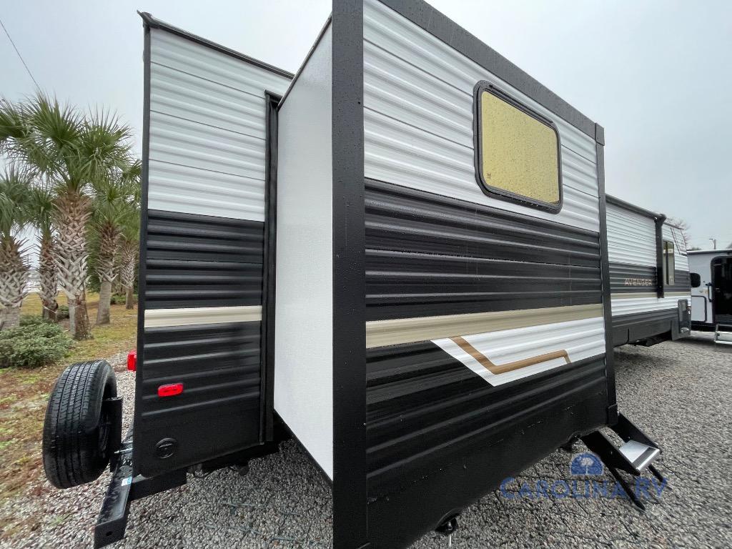 With any Avenger travel trailer by Prime Time RV, you will find innovation, a solid build, and comfort at every turn. Each model is built with Tuff Coat on the exterior metal, a fully enclosed underbelly, and a PVC roof membrane to help extend the life of your trailer. You will also find automotive name badging on the exterior, along with an exterior shower, front rail LED light strips, plus an XL padded entry grab handle to name a few conveniences. There are plenty of storage spaces inside, as well as Congoleum flooring and woven PVC marine grade slide out flooring, a designer shower surround, and seamless pressed countertops. You are sure to appreciate the onboard water filtration system, tankless water heater, plus 30K BTU furnace and 15K ducted A/C to help keep you comfortable.