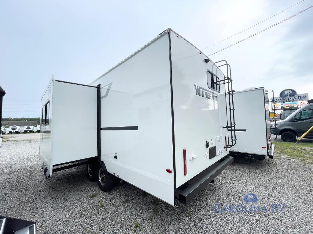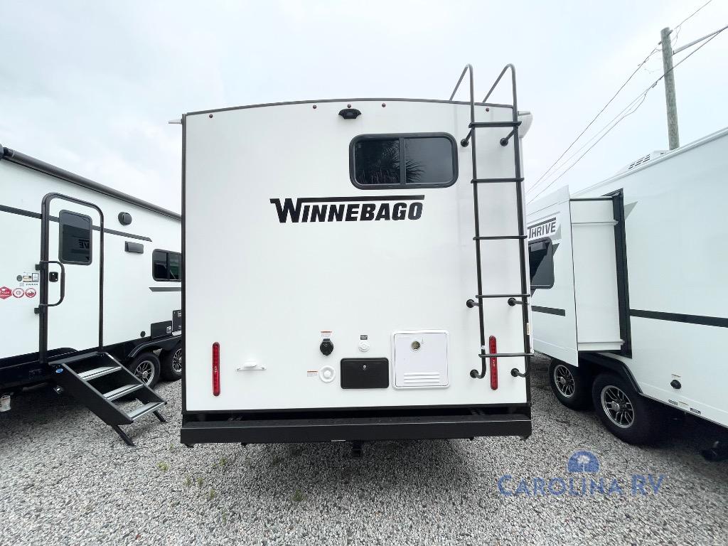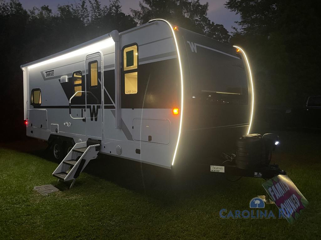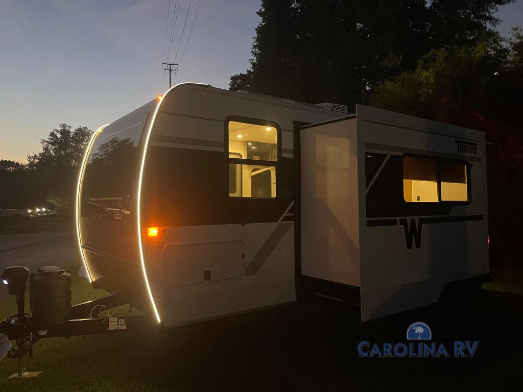 With any Thrive travel trailer by Winnebago, you can camp with functionality, comfort, and convenience! The tinted and frameless front window will be the first thing that catches your eye, and the fiberglass sidewalls with Azdel Onboard provide a durable trailer made to last. There is also an exterior ladder, along with front radius profile lights, power stabilizer jacks, and a powered awning with LED lighting to name a few exterior features. You will stay powered up by the 30-amp power cord and 200-watt solar panel, plus there is a tankless water heater for endless hot showers. Inside, you'll love the custom Winnebago furniture, carpetless side outs, molded fiberglass countertops, and residential recessed ceiling lights to keep your space well lit!